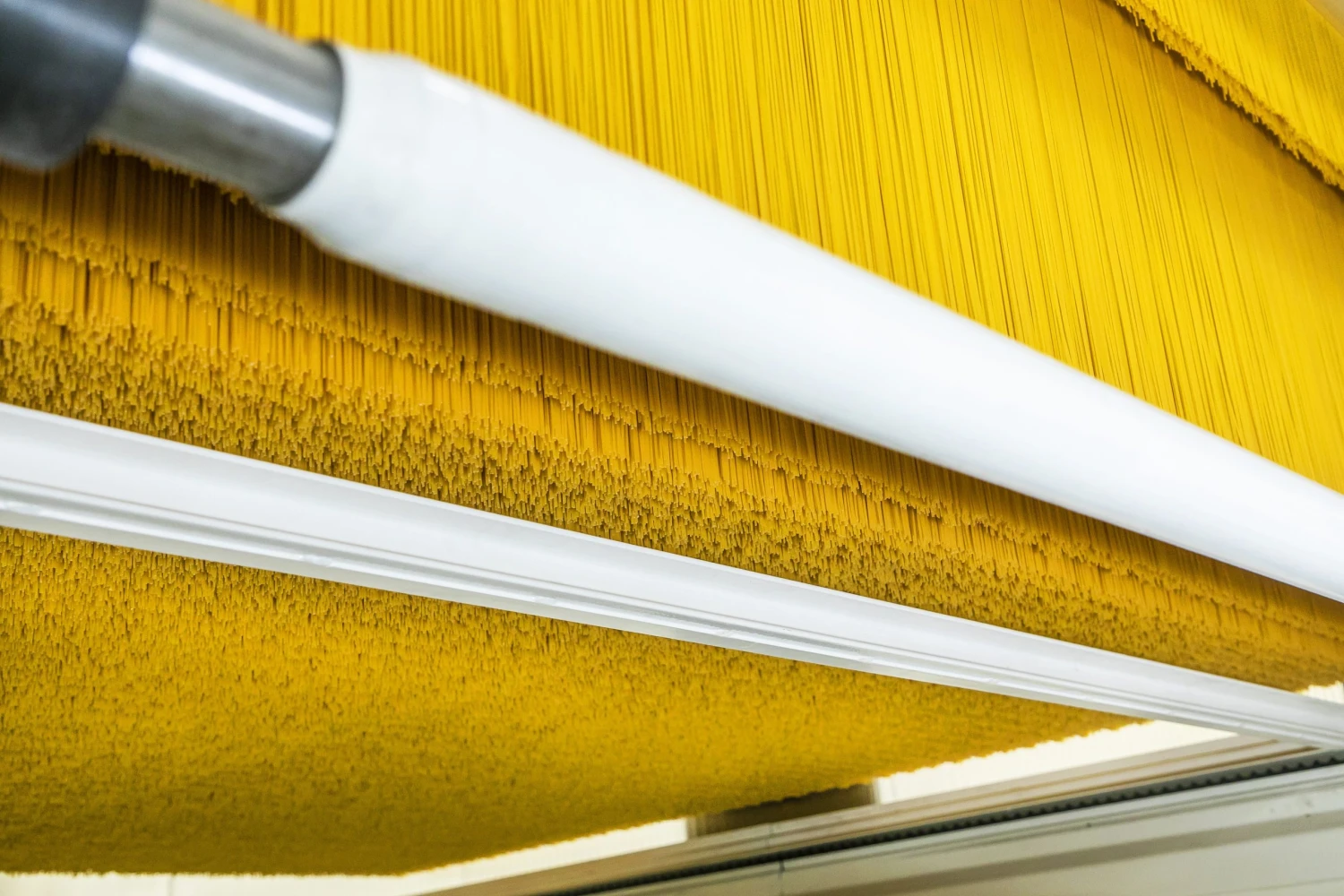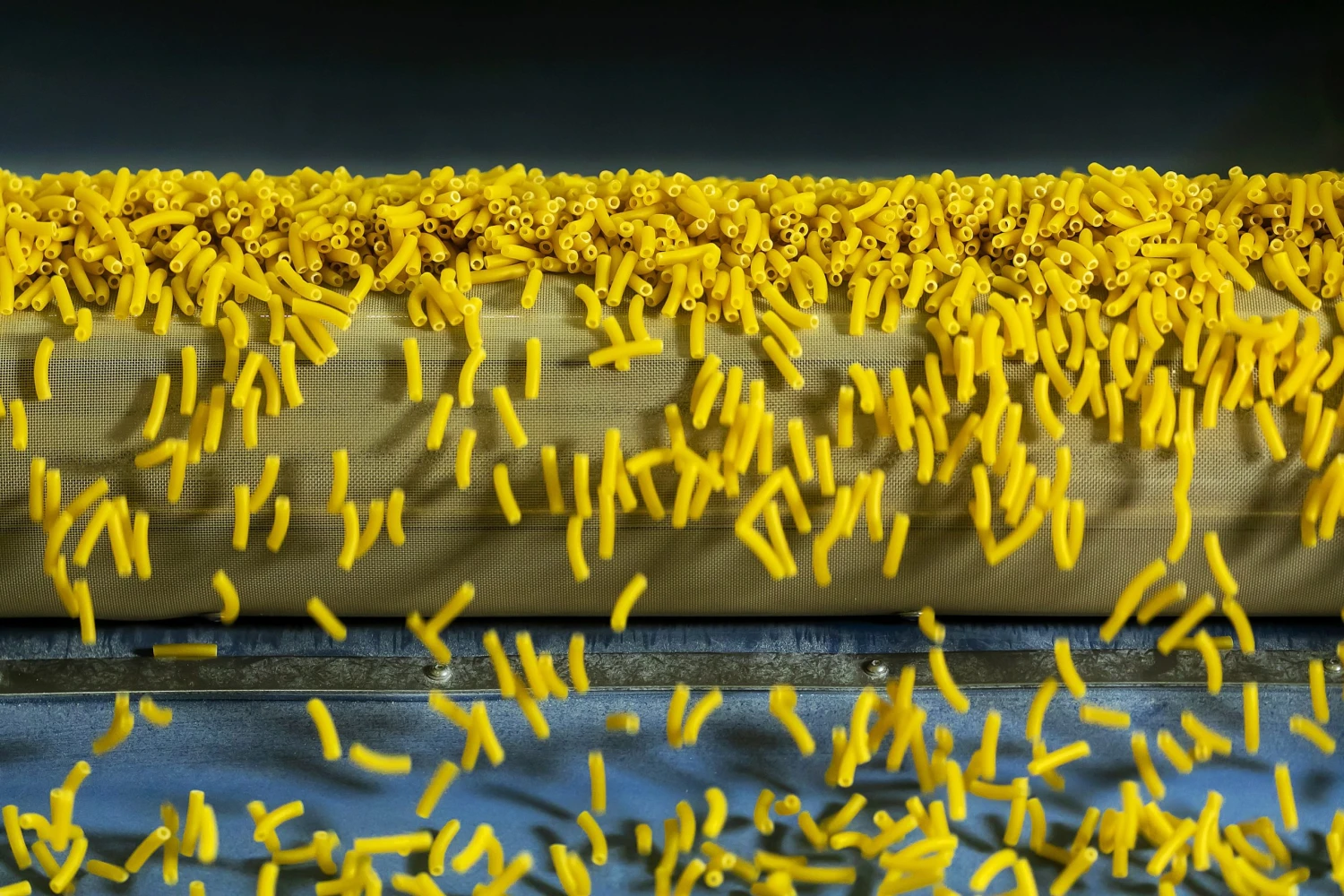 V průzoru stroje je vidět, jak tu každou sekundu vznikají desítky malých zlatavých vývrtek. Cavatappi, jak se těmto těstovinám říká, se v rachotící mašině doslova derou na svět.