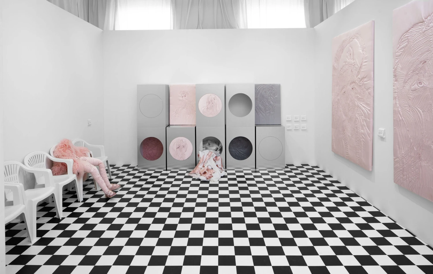 Výstavní sál Trafo Gallery se proměnil na prádelnu. Umělkyně Lucie Rosická nachází v praní paralely s mateřstvím. Vystavuje tu nejnovější díla, která zkušenost popisují bez příkras i klišé. | Foto se svolením Trafo Gallery