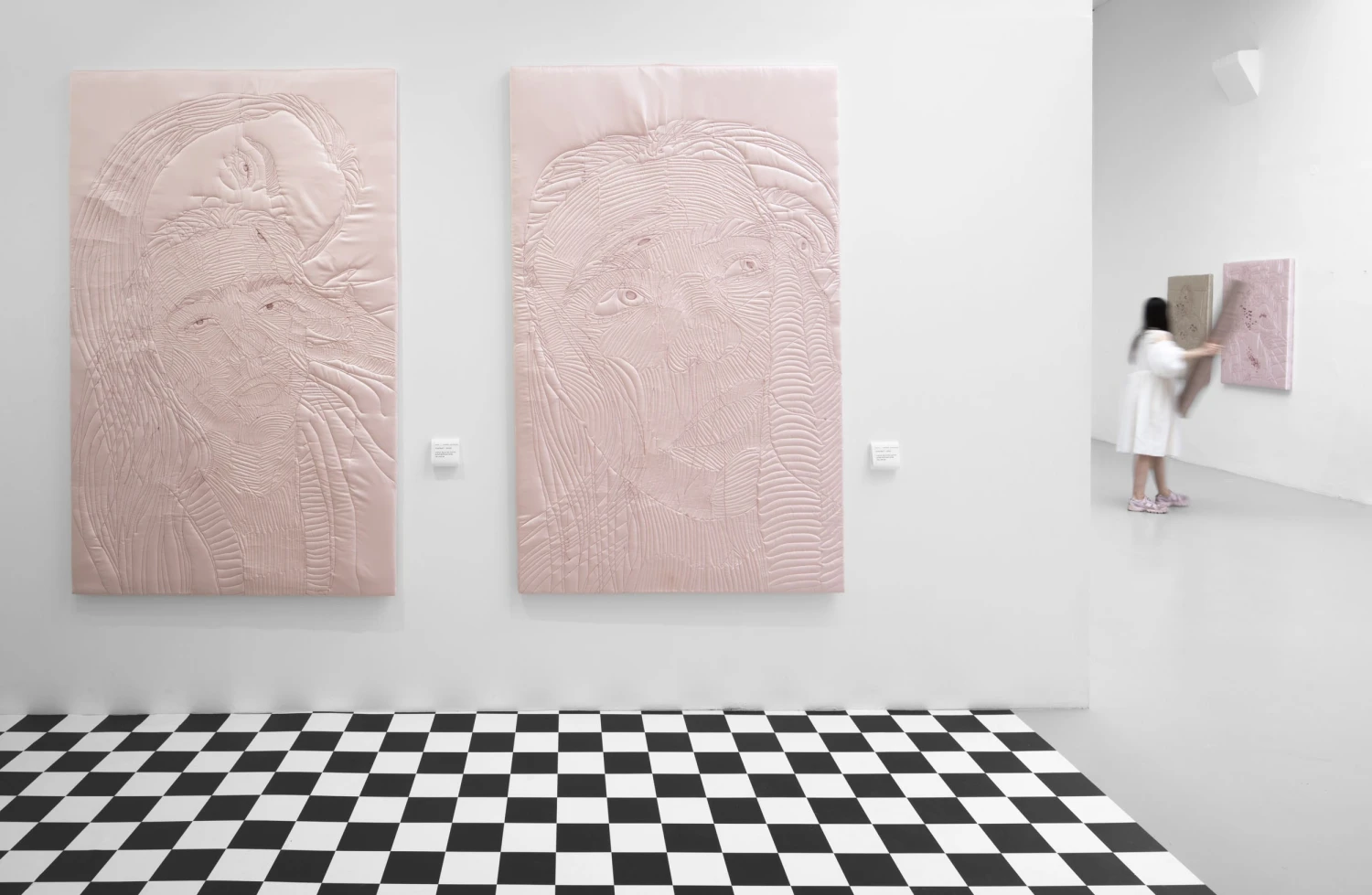 Rosická už několik let tvoří textilní reliéfy – ve svém ostravském ateliéru ručně prošívá látky. V nových obrazech jí je poprvé vidět do obličeje. „Díky porodu a mateřské péči už neznám stud,“ říká. | Foto se svolením Trafo Gallery