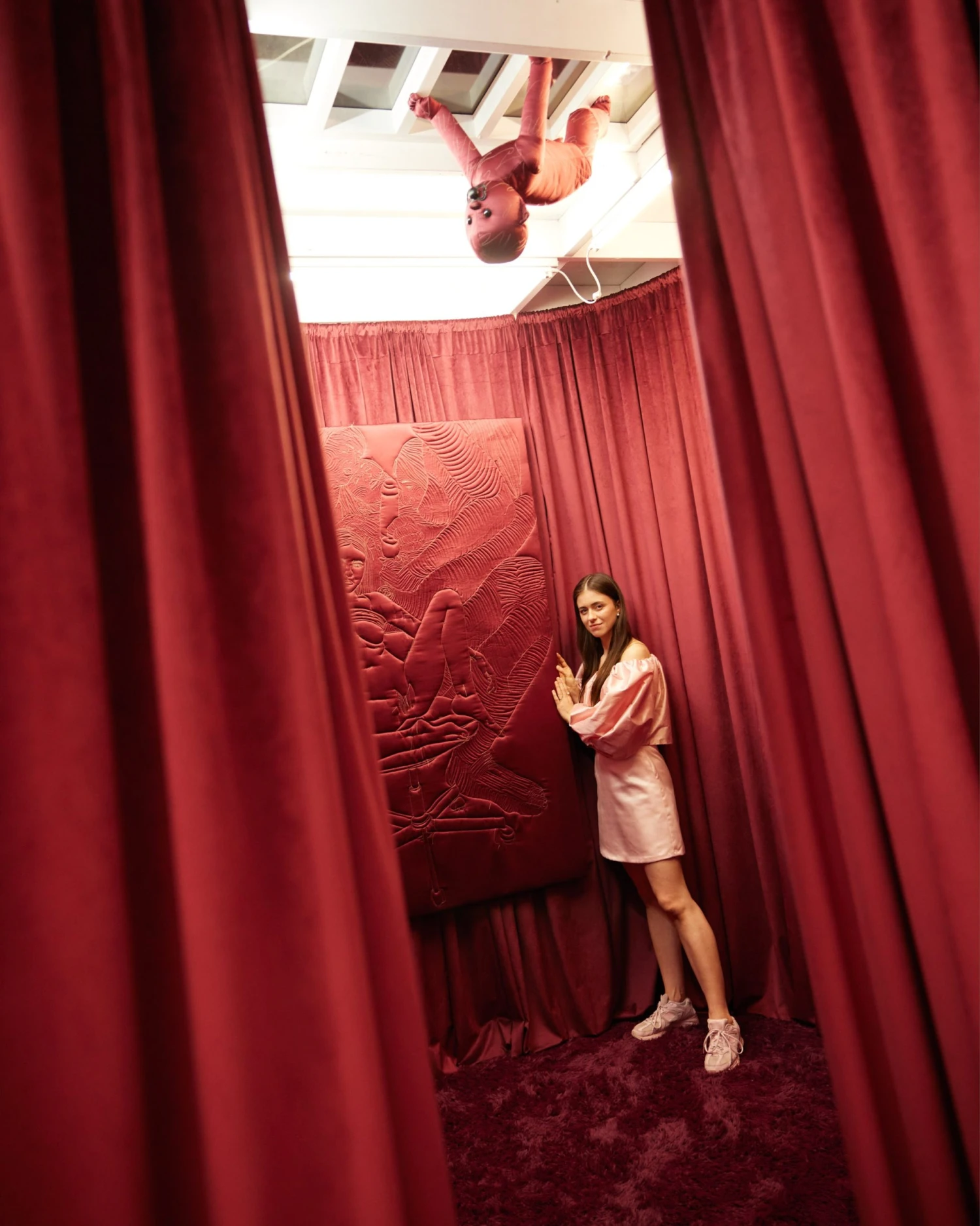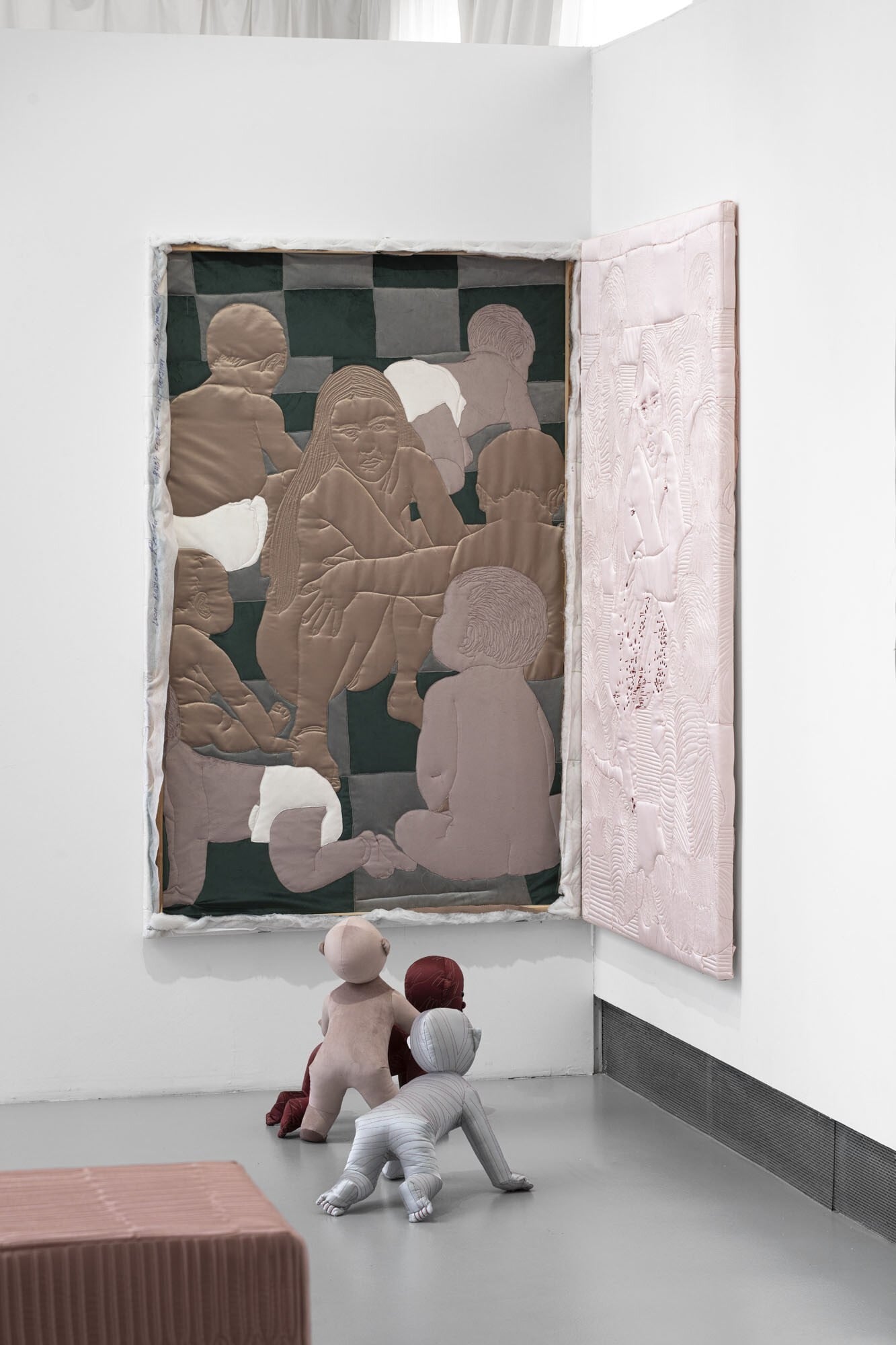 Řeč je o vycpaných batolatech, která až do poloviny června najdete ve výstavním sále Trafo Gallery. Přítomná jsou tu doslova na každém rohu. Když o ně nezakopnete fyzicky, na podlaze síně, s velkou pravděpodobností na ně v nějaké podobě narazíte v jednom z mnoha textilních reliéfů v Ostravě usazené umělkyně Lucie Rosické.