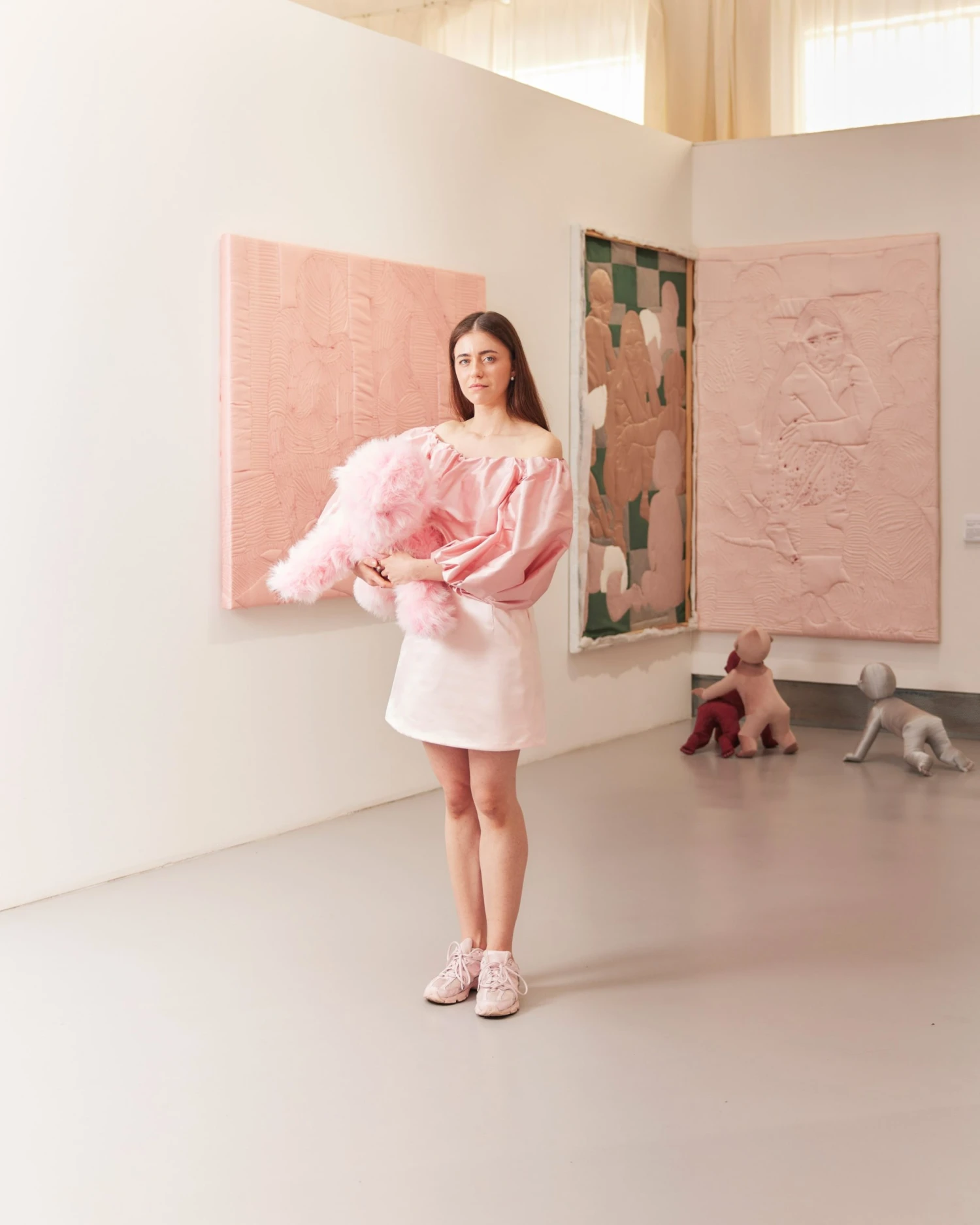 Kdybyste si dali tu práci, spočítat by se dala snadno. Jedno – roztomilé, růžové, chlupaté – na vás kouká ze schodů, ta další – tentokrát šedivá a vínová – se srocují u jednoho z obrazů v rohu místnosti. Obličeje nemají, jejich síla však vychází z počtu, převahy prostupující celým prostorem.