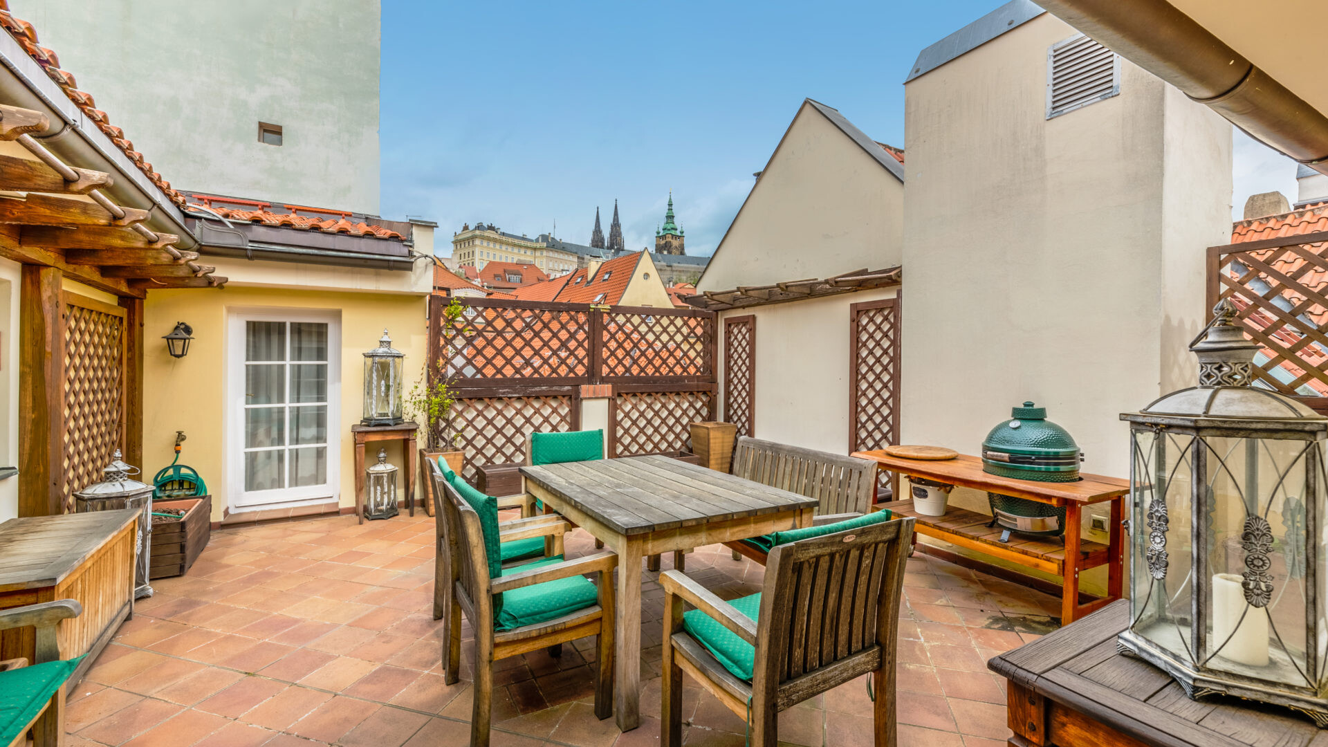 Podlahy z masivního dřeva, romantické stropní trámy, pokoje vybavené restaurovaným historickým nábytkem, sbírka umění i koberců a zejména terasa, na níž můžete snídat přímo pod věžemi svatovítské katedrály… To vše propůjčuje pětisetmetrovému bytu unikátní genius loci.