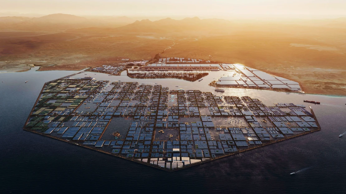Megalomanský futuristický projekt saúdskoarabského prince Muhammada bin Salmána, ve kterém má jednou žít přes devět milionů lidí. Skládat se má z několika oblastí včetně lineárních mrakodrapů, lyžařského střediska nebo plovoucího přístavu.