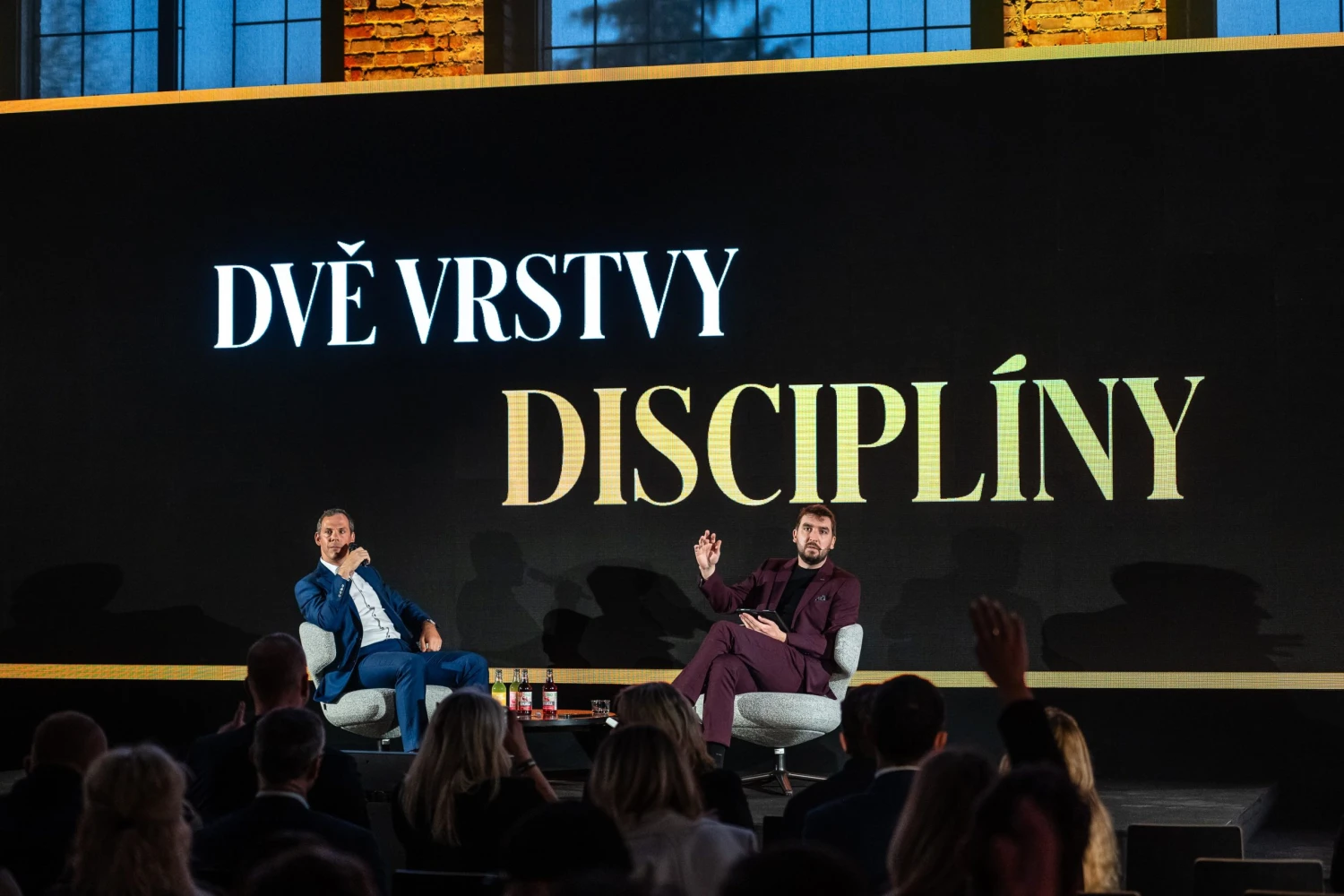 David Sajner (vlevo) hovoří na Forbes eventu Money Masterminds 2026. Vpravo šéfredaktor Forbesu a moderátor večera Zdravko Krstanov.