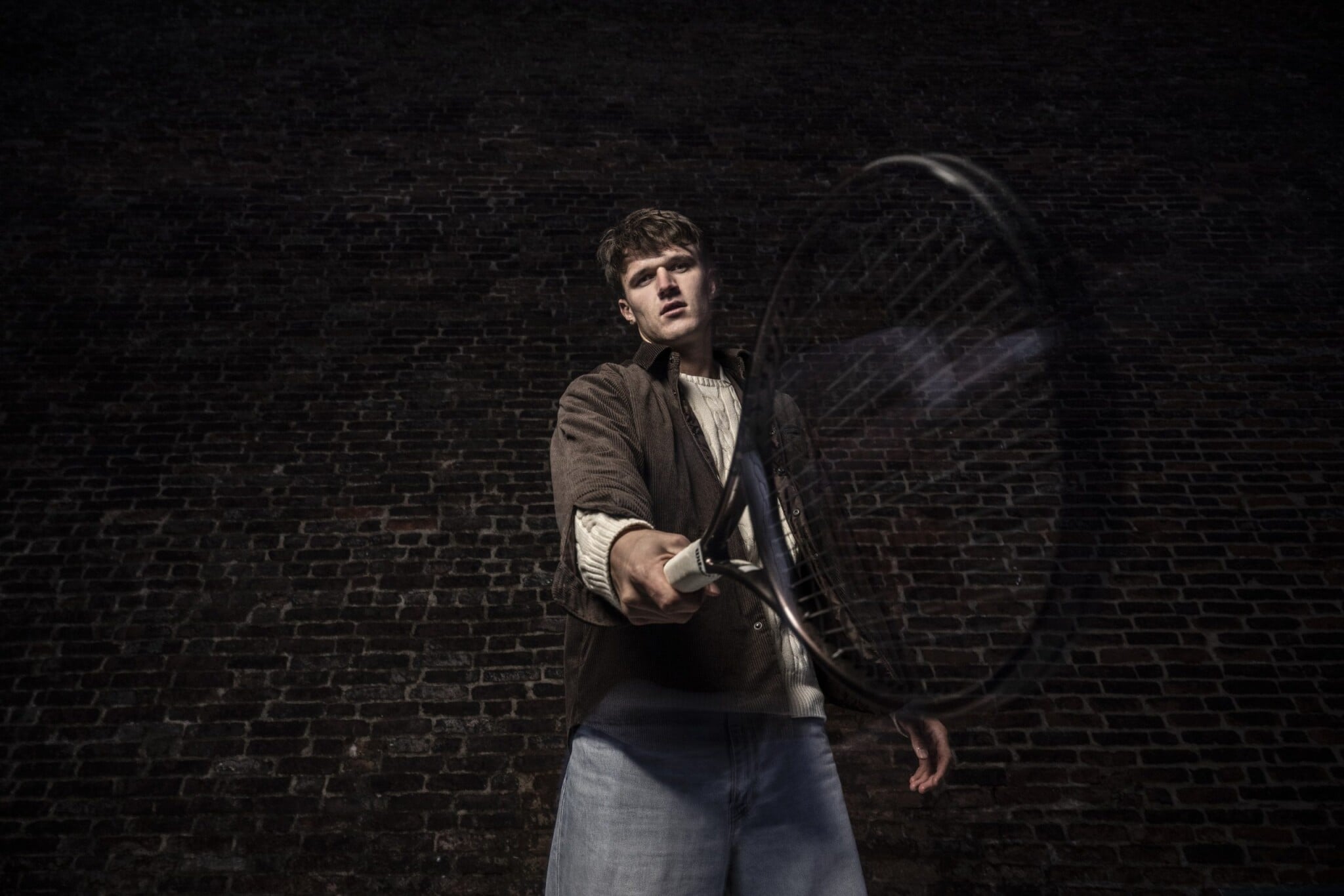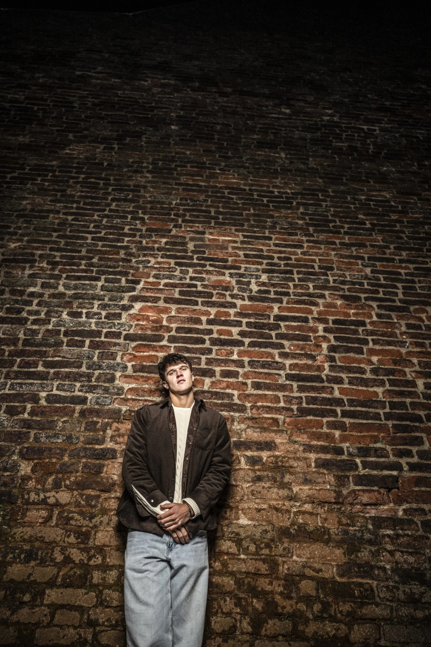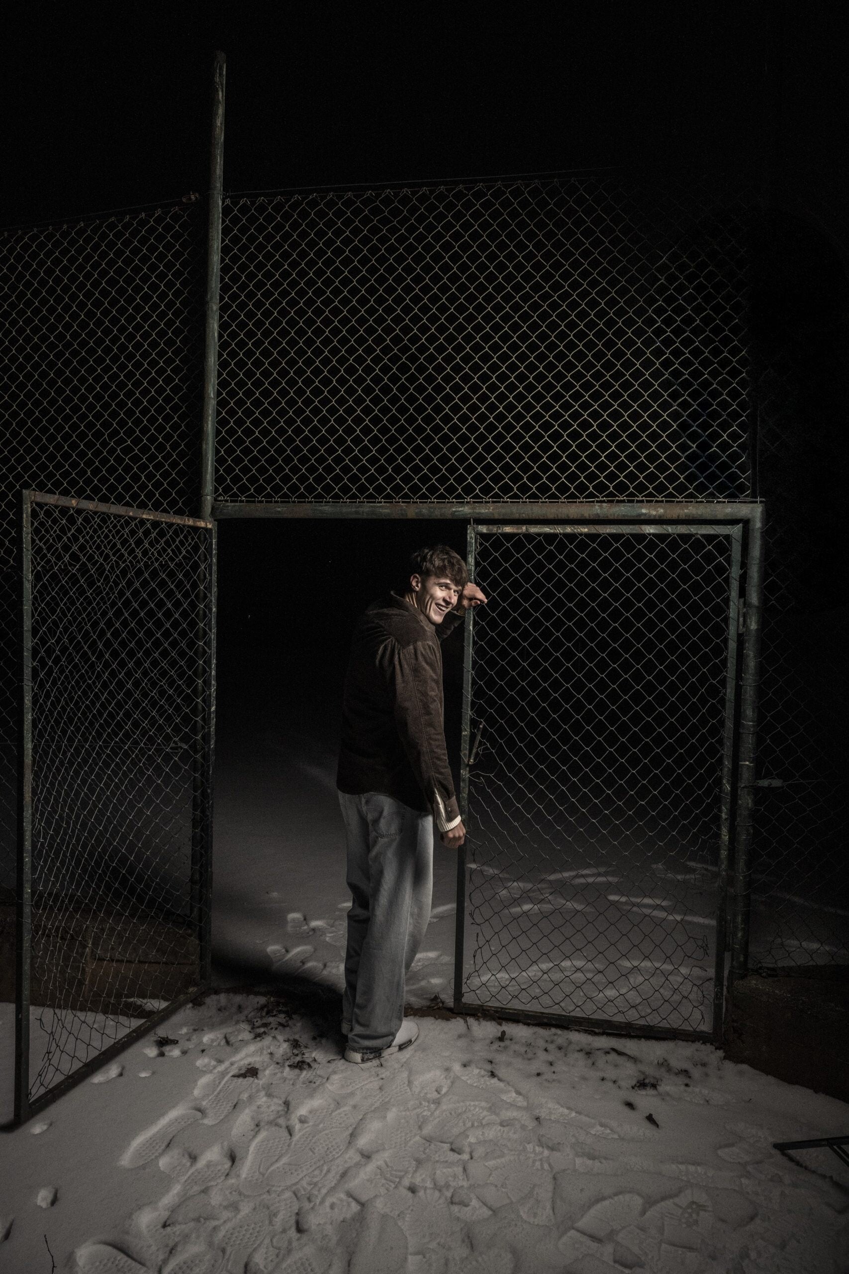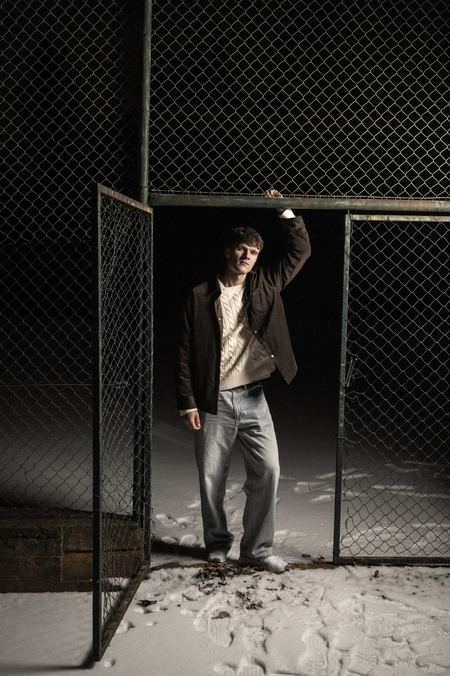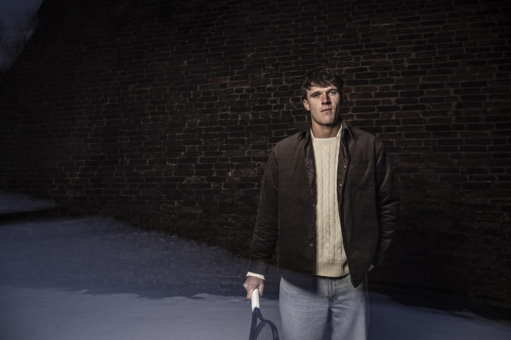 Působí vyrovnaně a sebevědomě. Ne hlasitě nebo nabubřele. Když stojí před objektivem foťáku, je soustředěný, skoro jako by stál na kurtu. On na něm tedy stojí, jen ve sněhu, v oversize džínách, hnědé bundičce a pleteném bílém svetru. Skoro byste si ho mohli představit na tribuně Wimbledonu.
