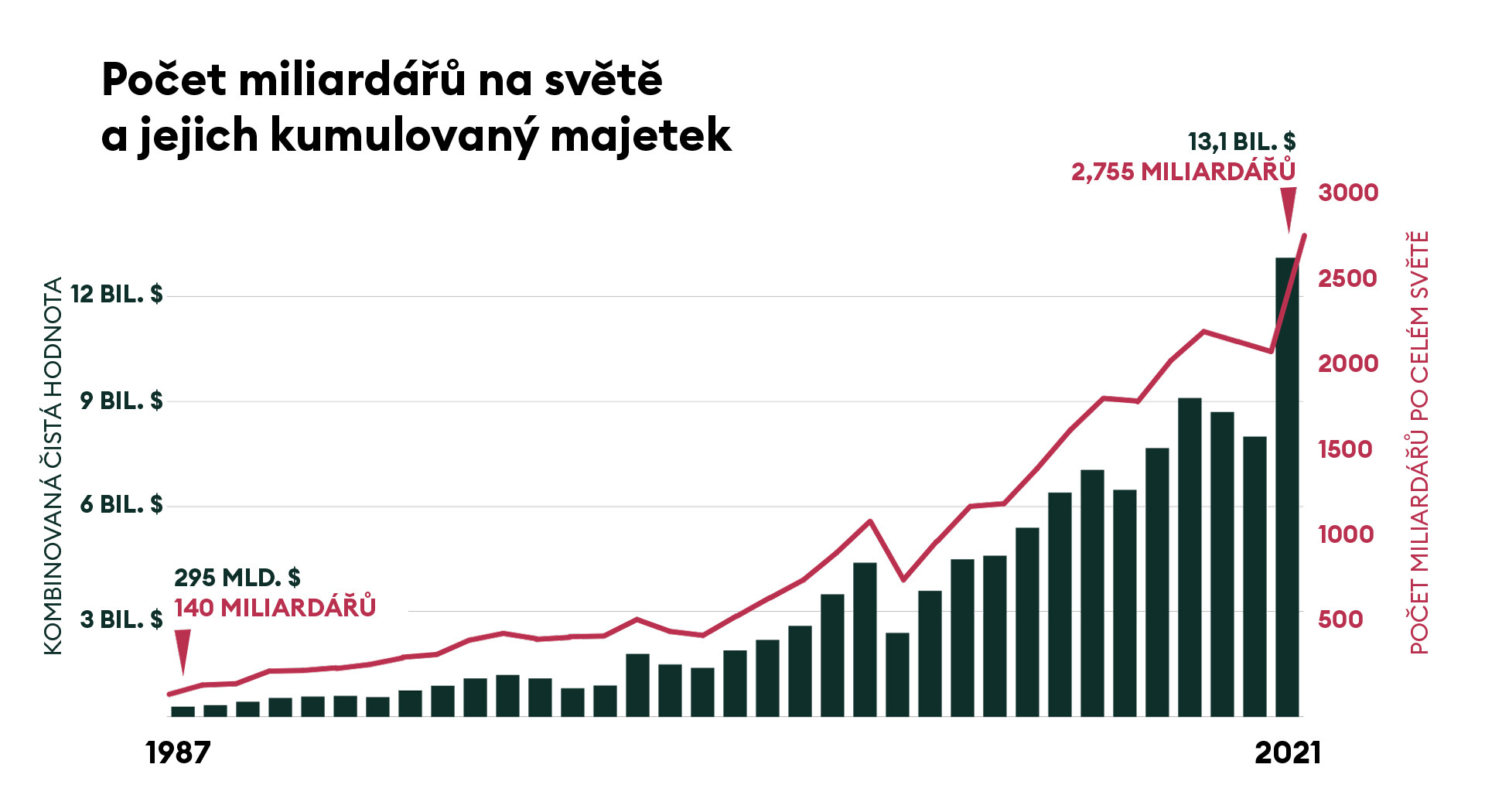Podle Forbesu se počet miliardářů zvýšil na 2755, což je o 660 více než v předešlém roce. A jejich celkový majetek vzrostl z osmi bilionů dolarů v roce 2020 na 13,1 bilionu dolarů.