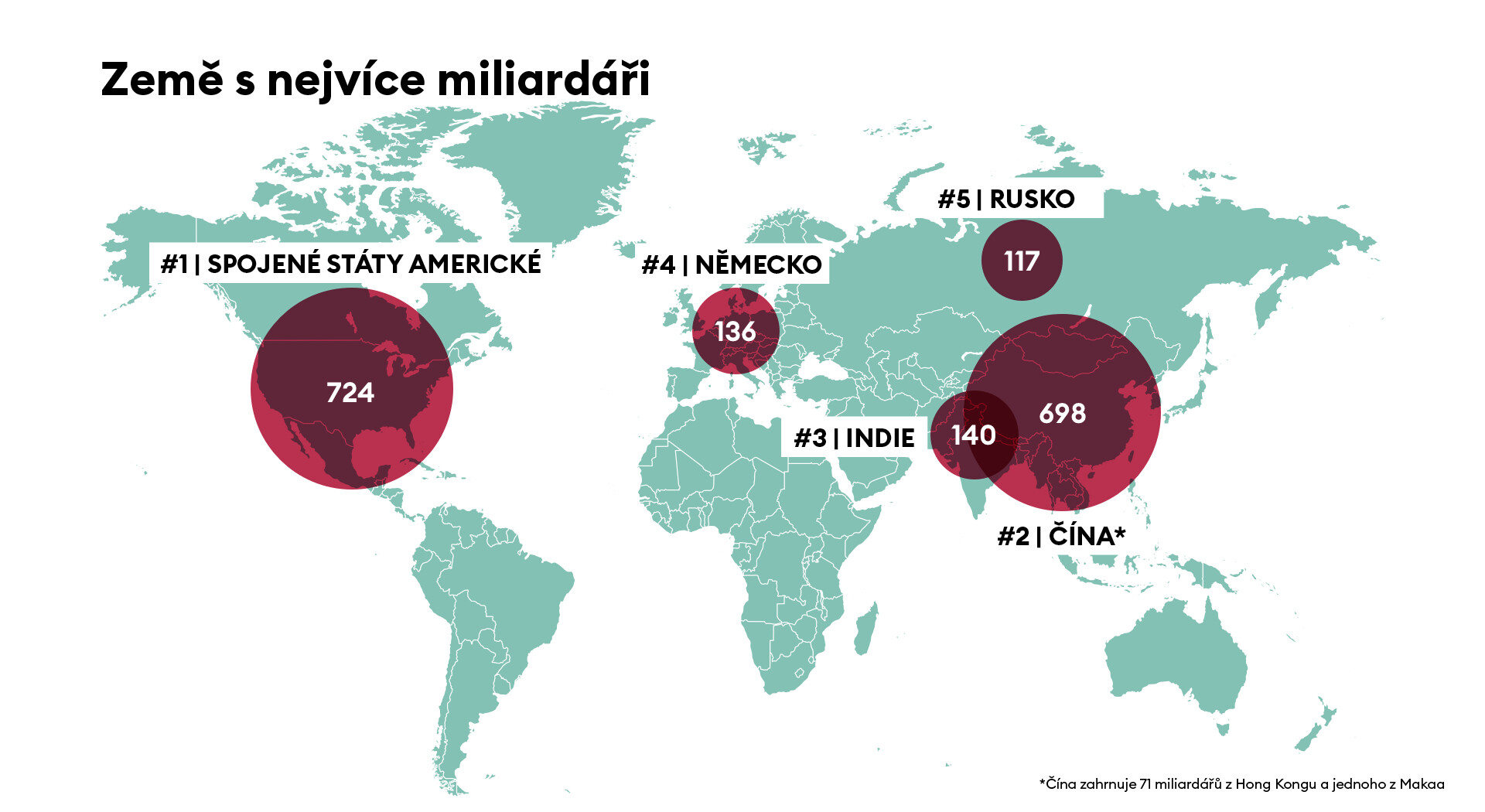 Mezi zeměmi mají stále nejvíce miliardářů Spojené státy americké, oproti loňskému žebříčku, v němž bylo 614 Američanů, jich je v tom letošním 724. Čína ale s počtem 698 miliardářů Spojené státy dohání (do čínské skupiny je započítáno i 71 miliardářů z Hongkongu a jeden z Makaa). Peking však už letos předběhl New York a stal se sídlem s největším počtem miliardářů na světě.