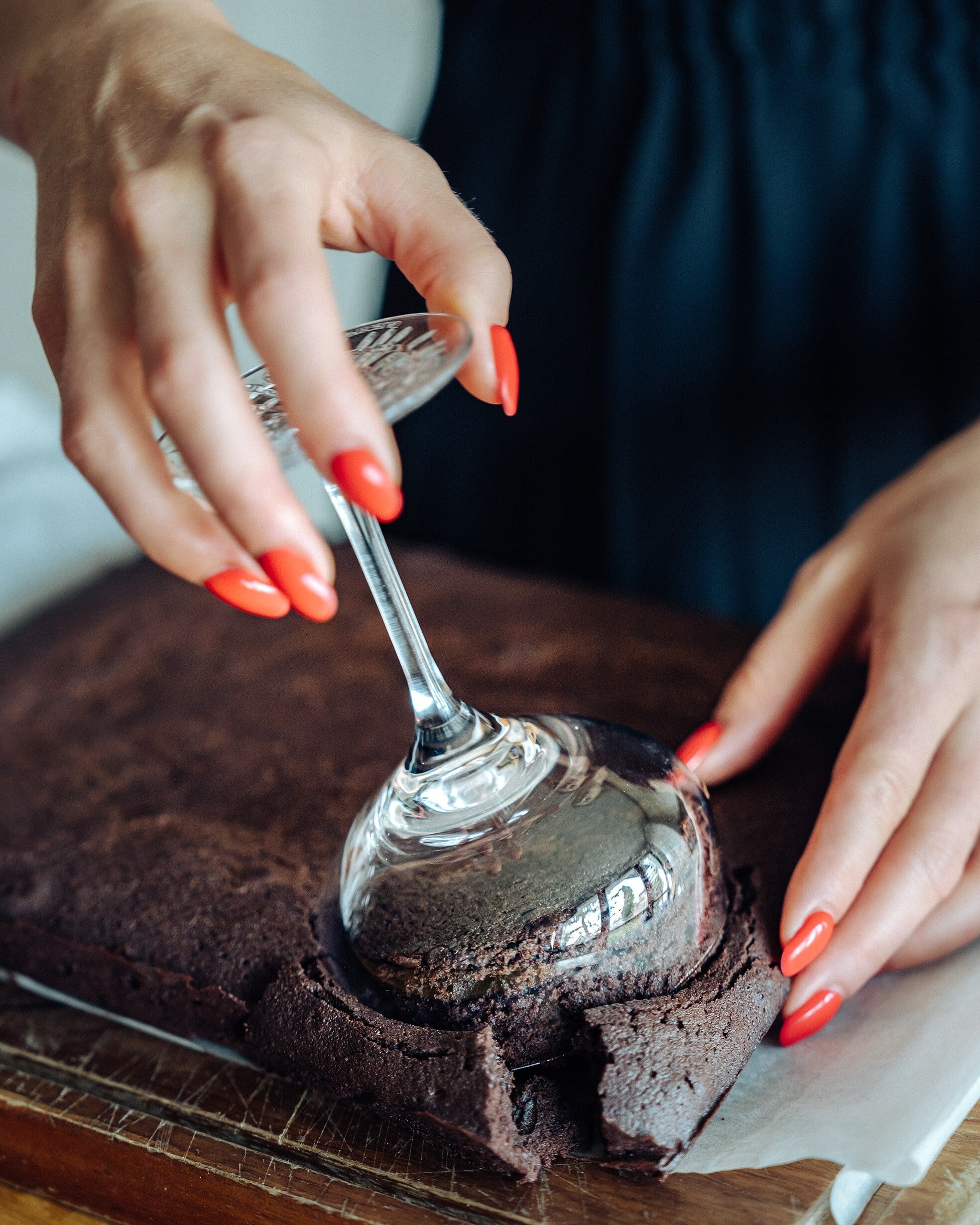 - Přímo pomocí skleniček, ve kterých budete dezert podávat, vykrojte z korpusu kolečka a opatrně je vtlačte na dno každé sklenice. Povrch brownies hojně potřete dalším likérem, případně alkoholem zředěným slabší kávou. Vnitřní okraje skleničky očistěte ubrouskem.