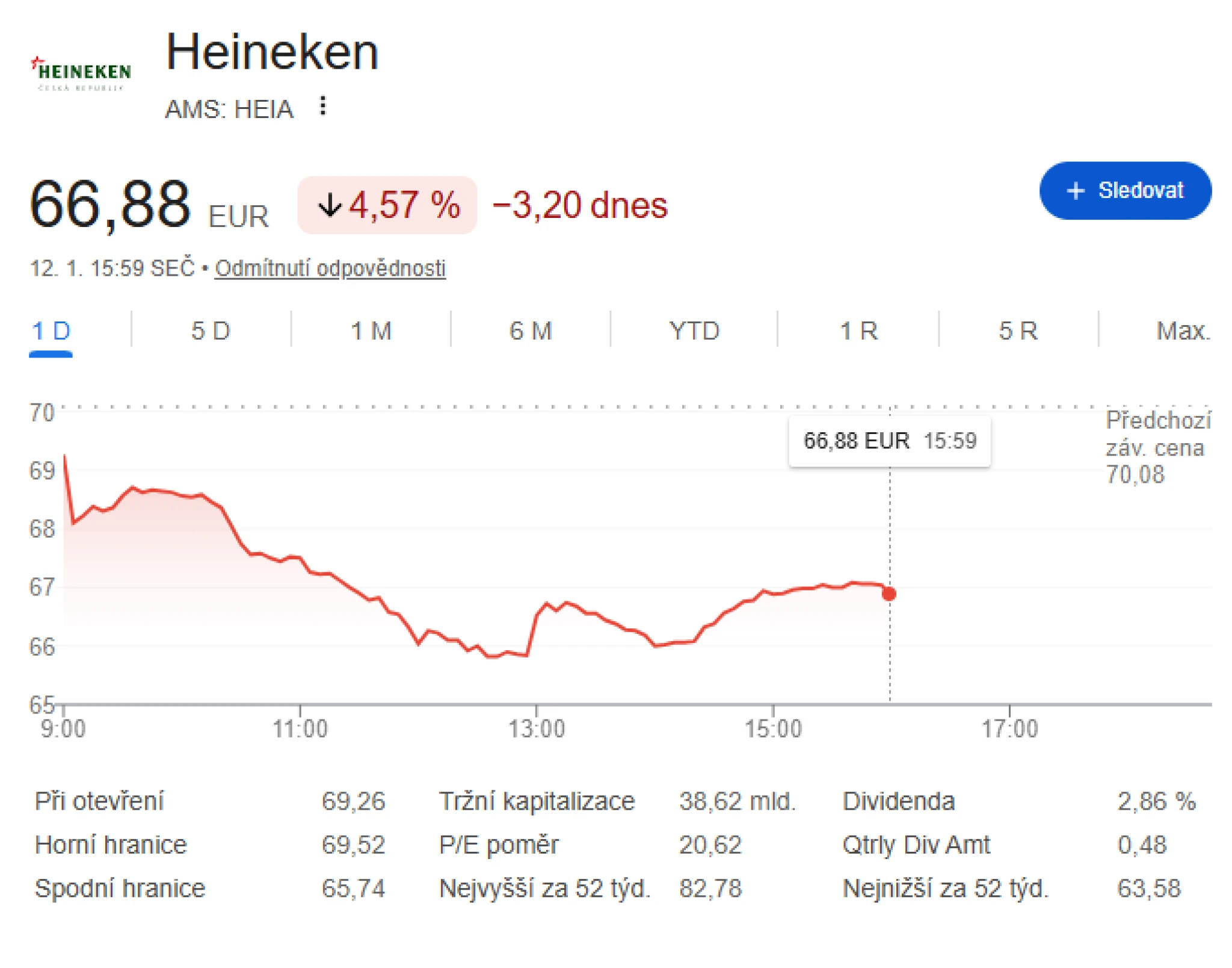 Akcie společnosti Heineken odpoledne ztrácely na burze v Amsterodamu přes čtyři a půl procenta. Nacházely se tak blízko ročního minima, které je nad 63 eury (1530 korun).