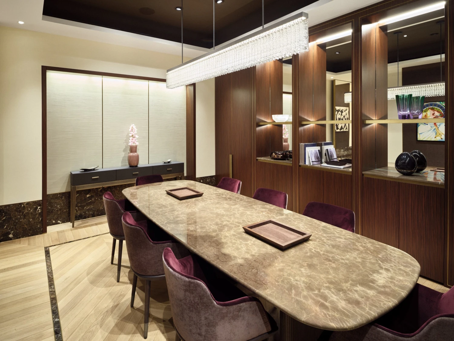 Interiér pracuje s materiály, které jsou pro značku typické: tmavé dřevo, mosazné detaily a dva druhy španělského mramoru. Vše je zpracované s důrazem na řemeslo, ale bez snahy příliš ohromovat. Stejný přístup pokračuje i v zadních částech butiku – za hlavní prezentační místností stojí onyxový bar a menší salonek s knihovnou, ideální pro delší konzultace.