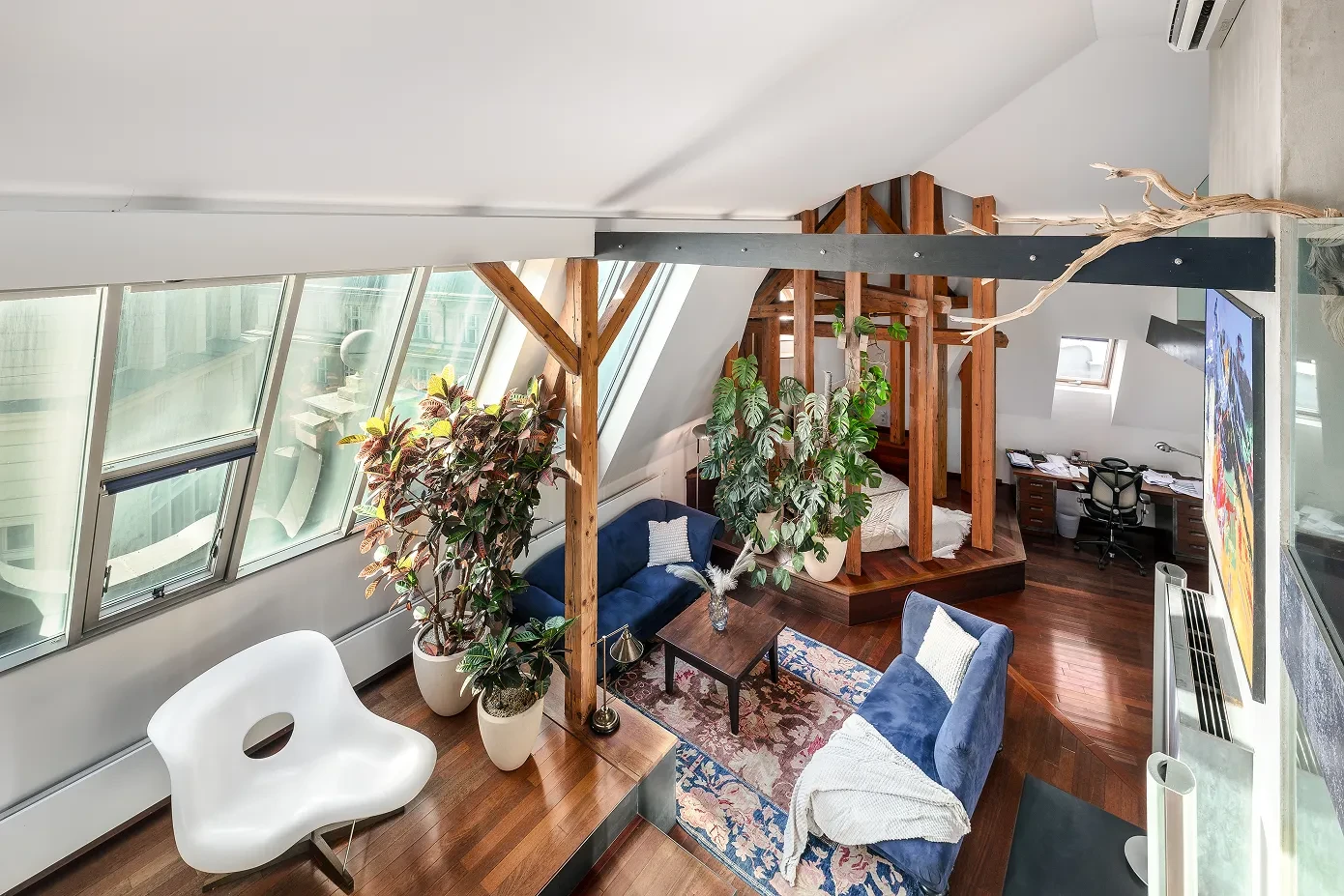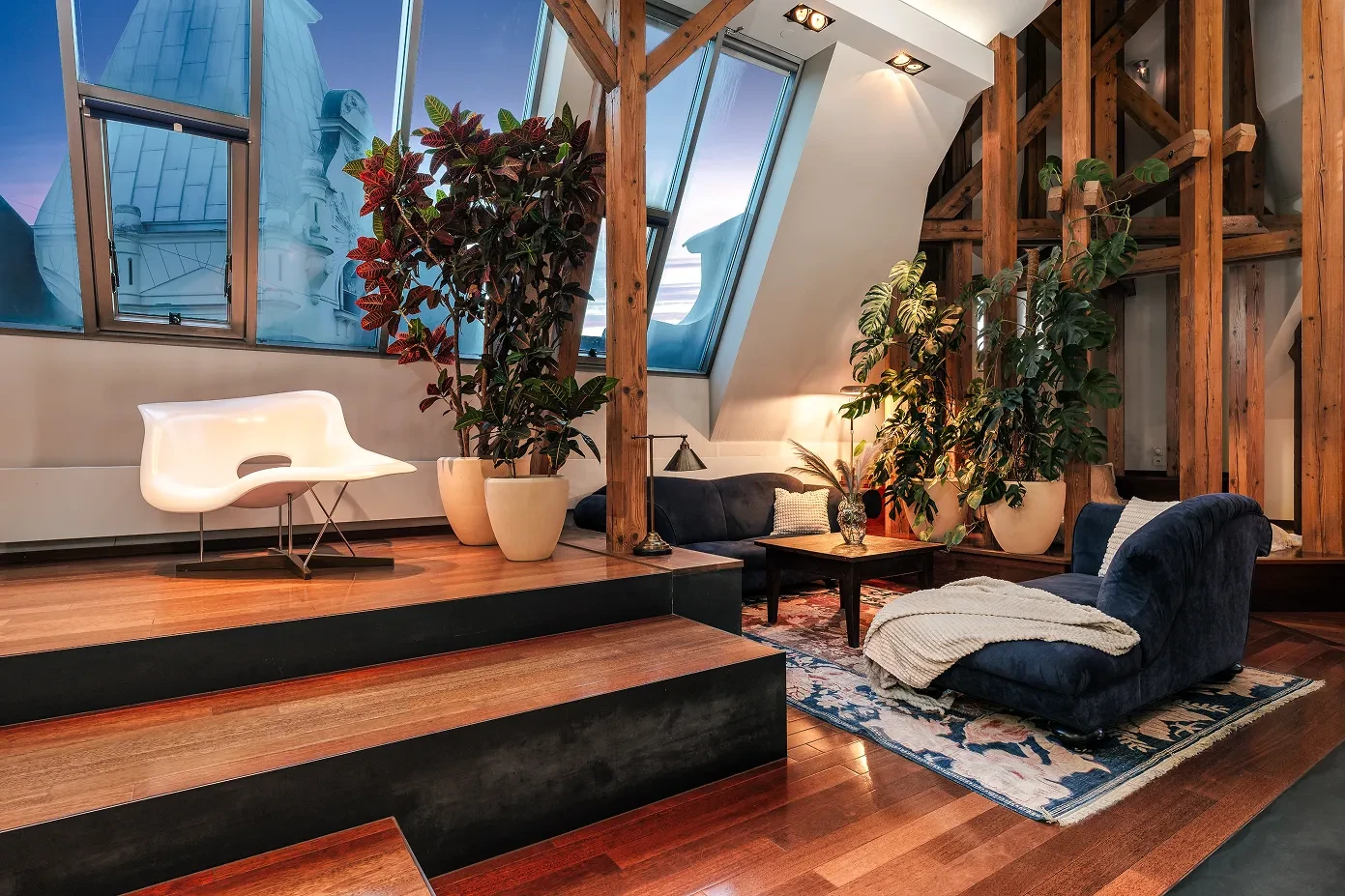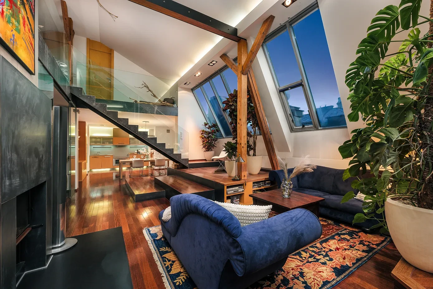 V jeho interiérech se spojují moderní prvky s historickými detaily a nechybí ani krb nebo dvanáctimetrová terasa s výhledy na historické střechy Starého Města. Hlavní obytná místnost má navíc výšku stropu sedm metrů a velká okna, takže o přísun světla je postaráno.