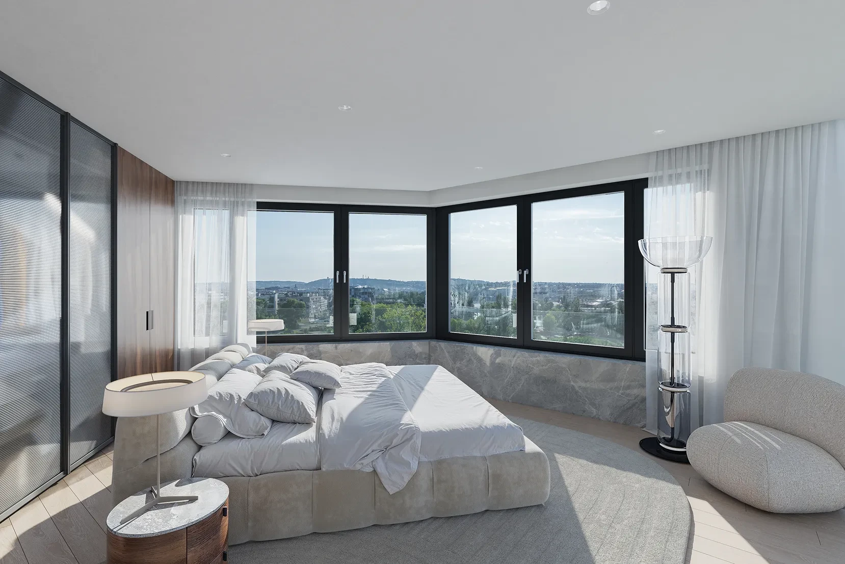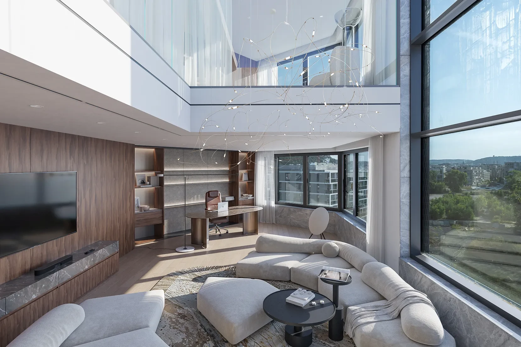 Hlavní část bytu tvoří obytný prostor s dvojitou výškou stropu, prosklenou stěnou a menší terasou. Další dvě terasy jsou ve druhém patře penthousu.