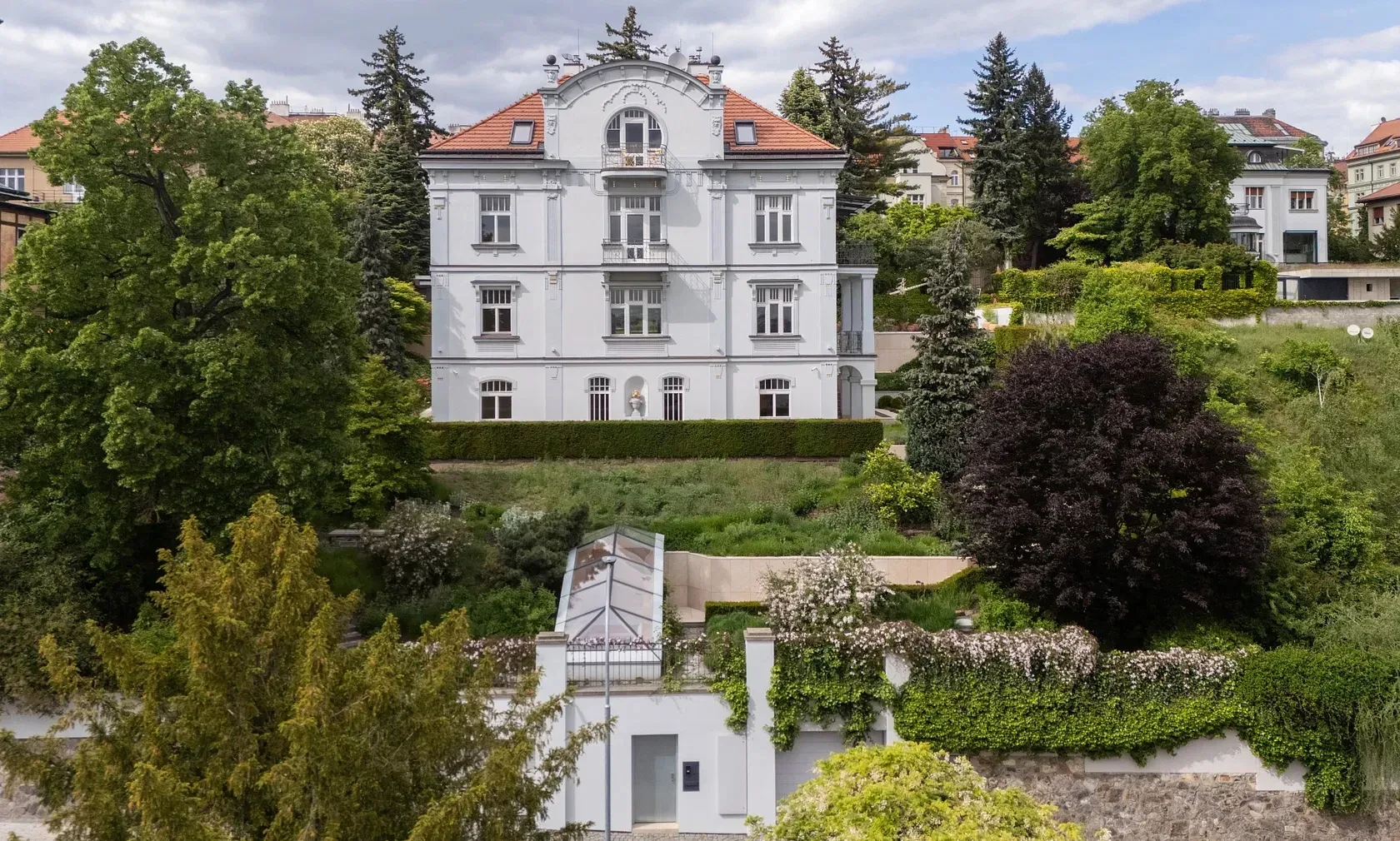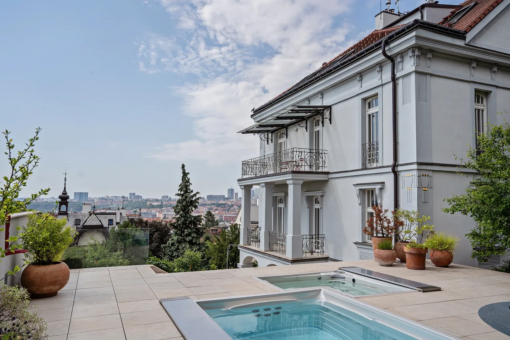 Vinohrady, Hradešínská ulice, jižní svah s výhledem na Prahu. Podobných míst v Praze moc nenajdete. Lokalita je ostatně jednou z předností této secesní vily z roku 1906.