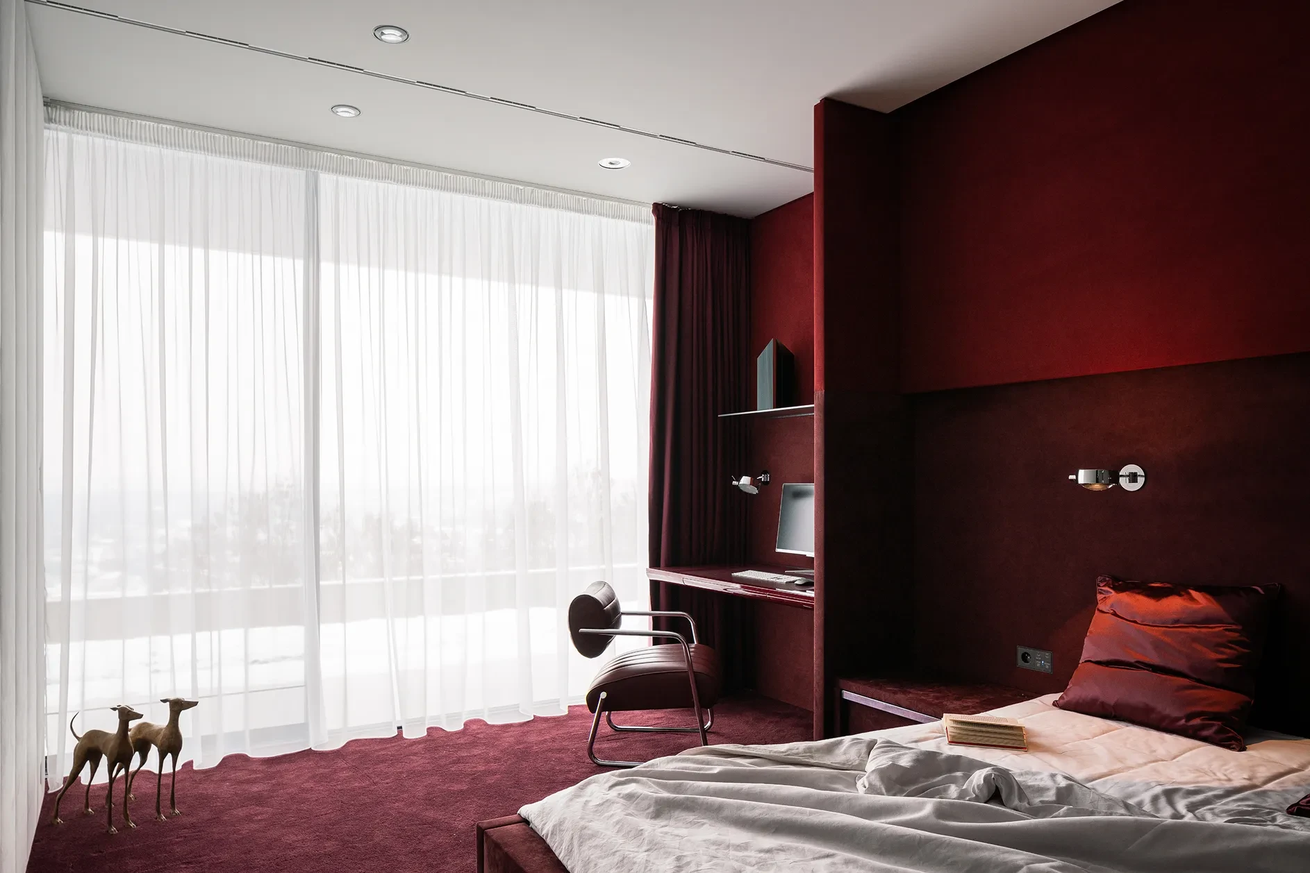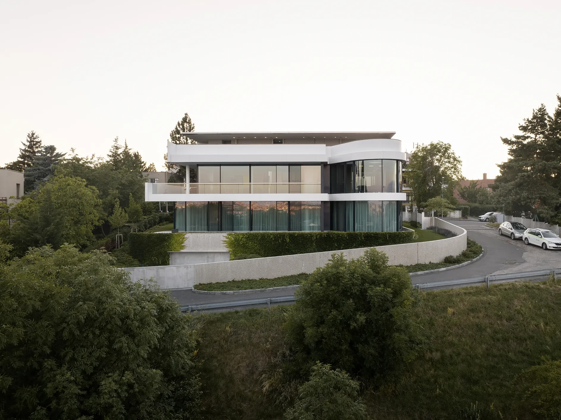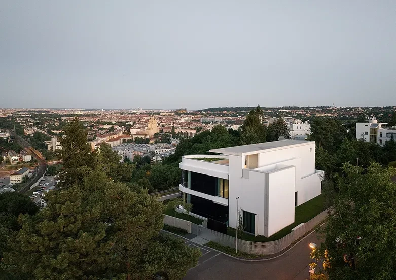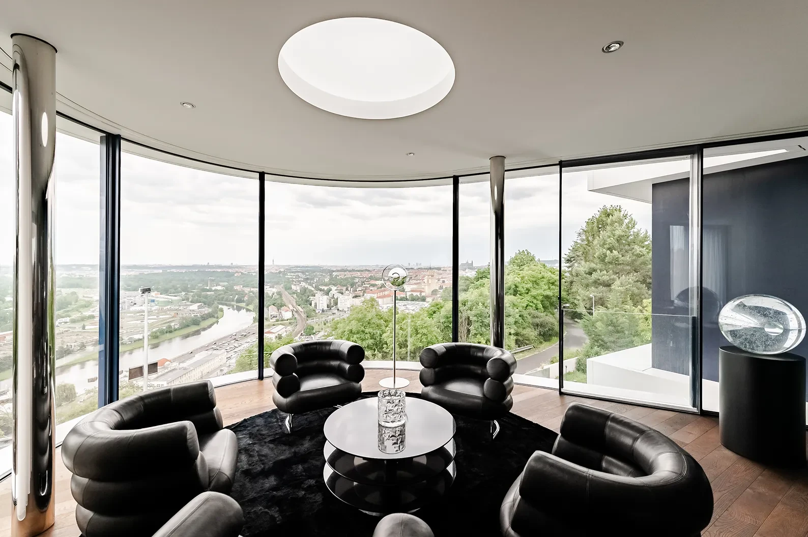 Nachází se na ostrohu nad vltavským údolím s panoramatickými výhledy na Prahu a najdete v ní vnitřní atrium a tři nadzemní a jedno podzemní podlaží, které propojuje osobní výtah s kabinou obloženou kamenem a alcantarou.