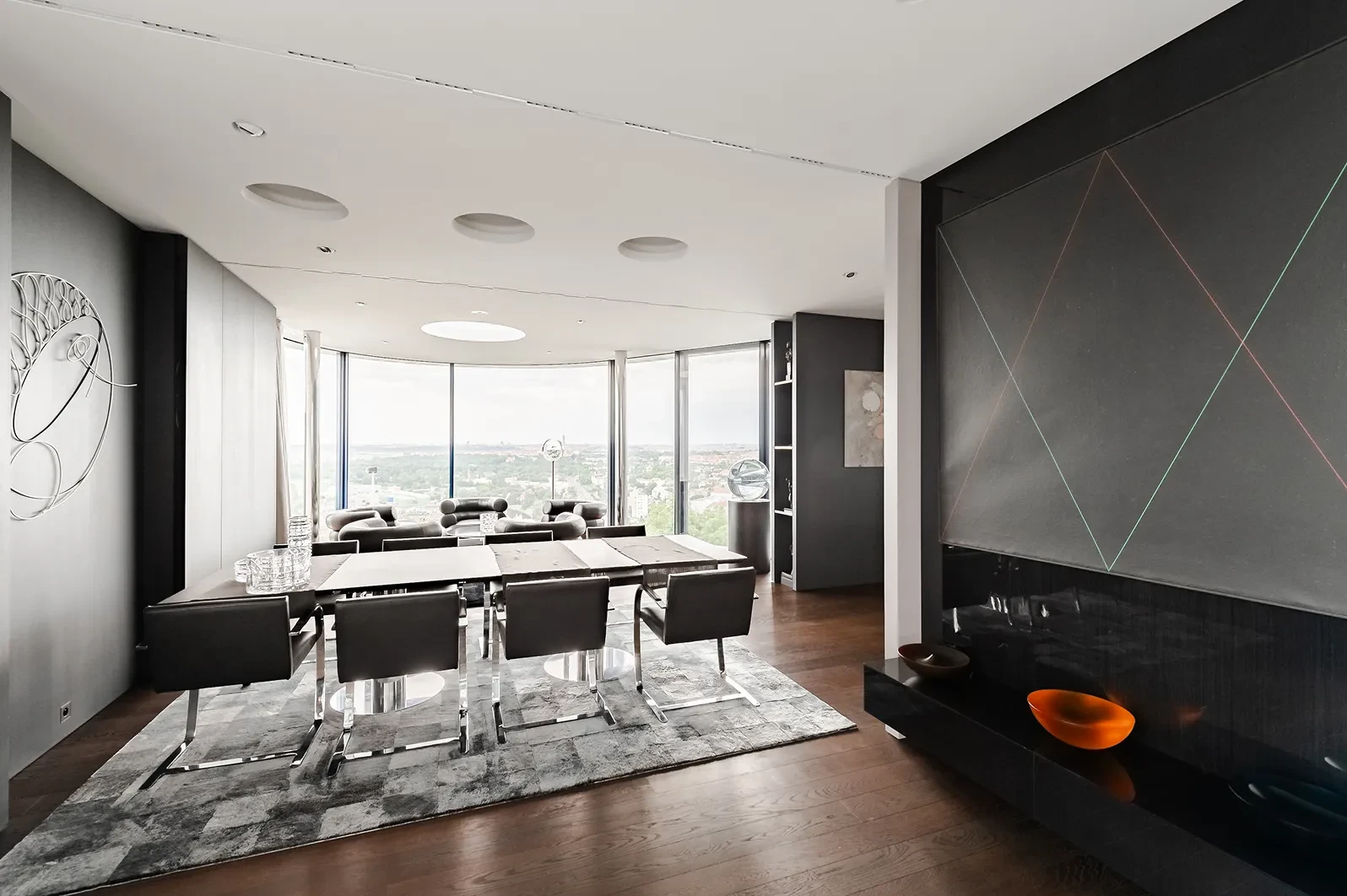 Součástí prodeje je i luxusní vybavení včetně uměleckých děl. K domu patří také pozemek se zahradou a na střeše se nachází velká terasa.