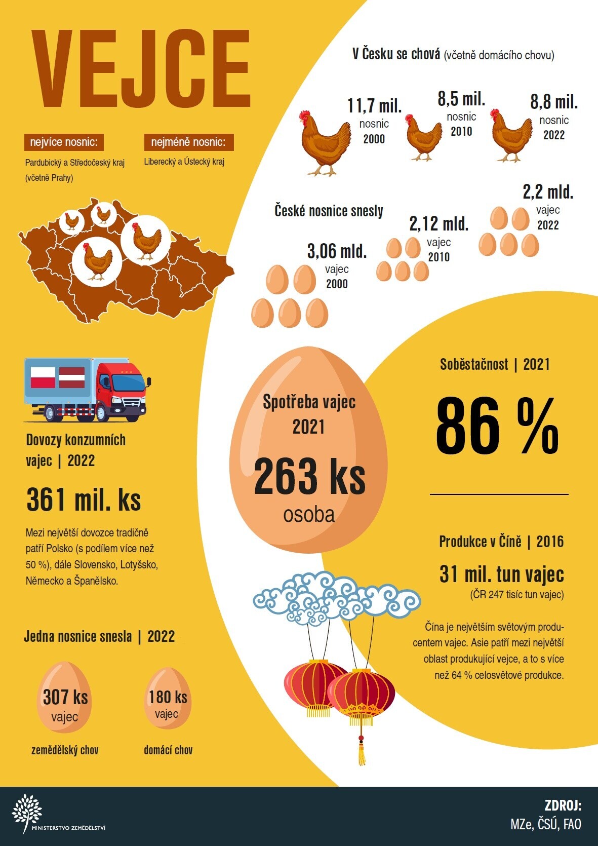 Podle statistik, které zveřejnilo ministerstvo, je nejvíce nosnic v Pardubickém a Středočeském kraji včetně Prahy. Nejméně naopak v Libereckém a Ústeckém kraji. Soběstačnost v produkci vajec byla posledních dat z předloňského roku 86 procent a průměrná spotřeba byla 263 kusů na osobu, uvedl resort. Drůbežáři spolu s Agrární komorou ČR již dříve upozorňovali na to, že soběstačnost může klesat kvůli zákazu klecových chovů, který začne platit na začátku roku 2027. Podle komory je nyní stále asi šedesát procent nosnic v klecových chovech a podniky musí do přestavby hal investovat desítky milionů korun.