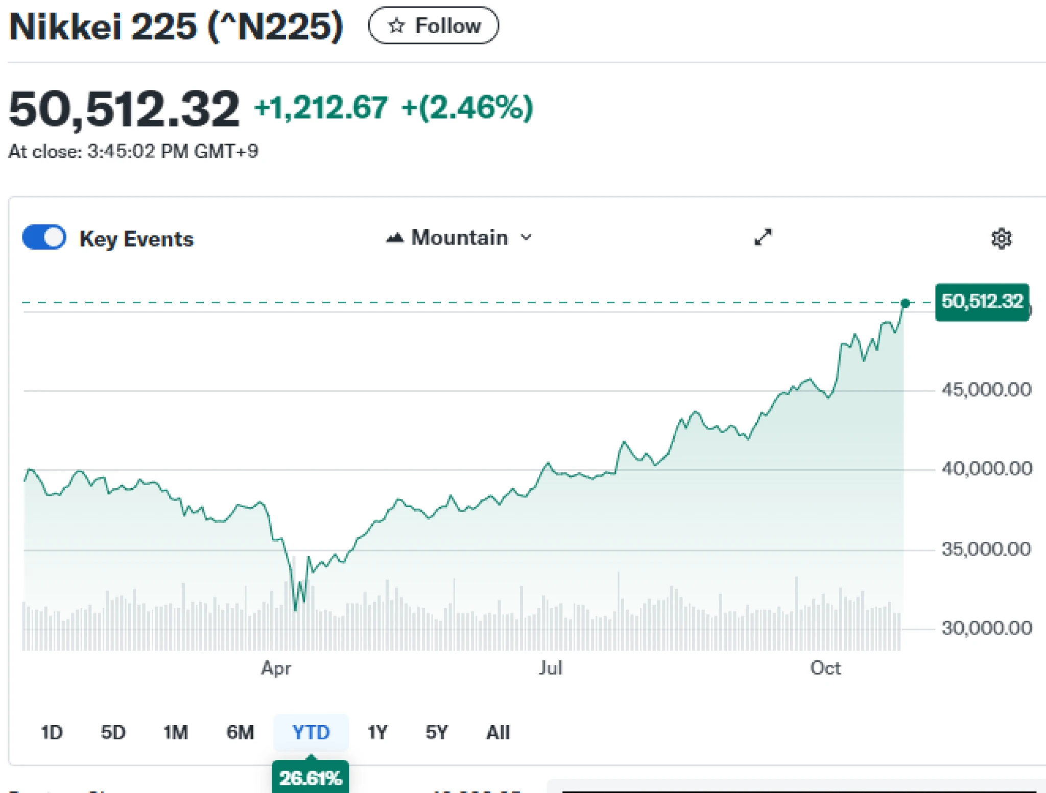 Japonské akcie zahájily týden výrazným růstem, hlavní index tokijské burzy Nikkei 225 tak poprvé překročil hranici padesáti tisíc bodů.