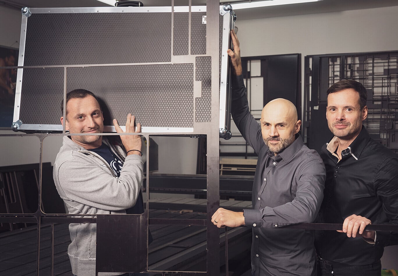 Zakladatelé Kytary.cz Vladimír Myslík (vpravo), Jan Pils a technický ředitel Tomáš Novák (vlevo), který je faktickou hlavou vlastní výroby futrálů.