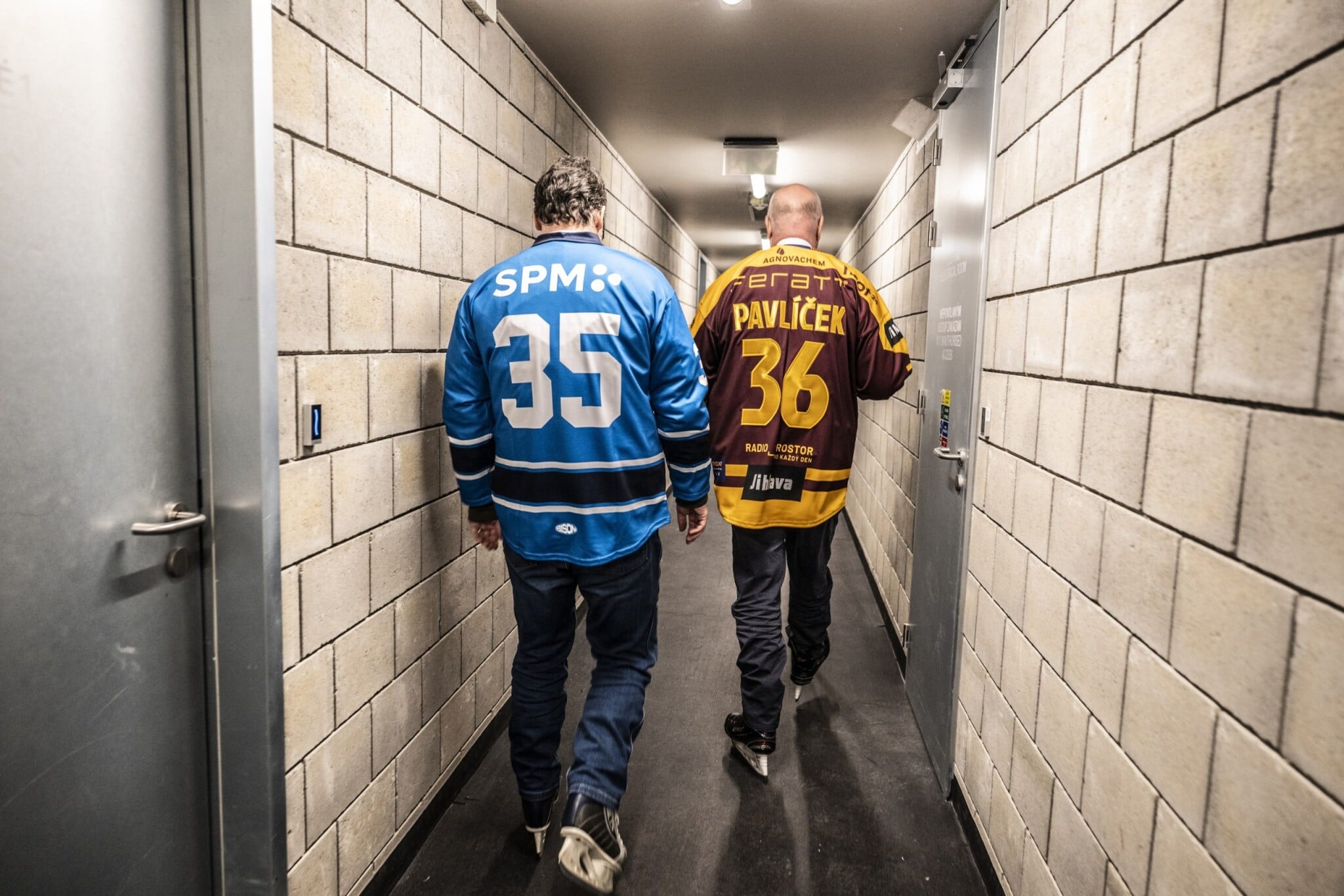 Vedle něj stojí jeho dlouholetý byznysový parťák Marek Španěl. „Pro Marka tady máme něco speciálního,“ dodává Pavlíček a vytahuje světle modrý hokejový dres s motivem zombie střílečky DayZ Frostline od Bohemia Interactive. „Ne, já si vezmu bundu,“ reaguje Španěl.