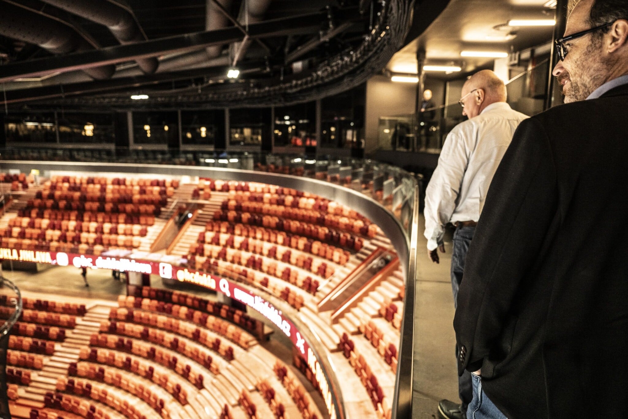 Po bruslení usedáme s podnikatelskou dvojicí opět ve skyboxu, zatímco na led naskakují děsiví krampusáci se zkouškou svého večerního vystoupení. Konverzace se opět stočí k hokeji.