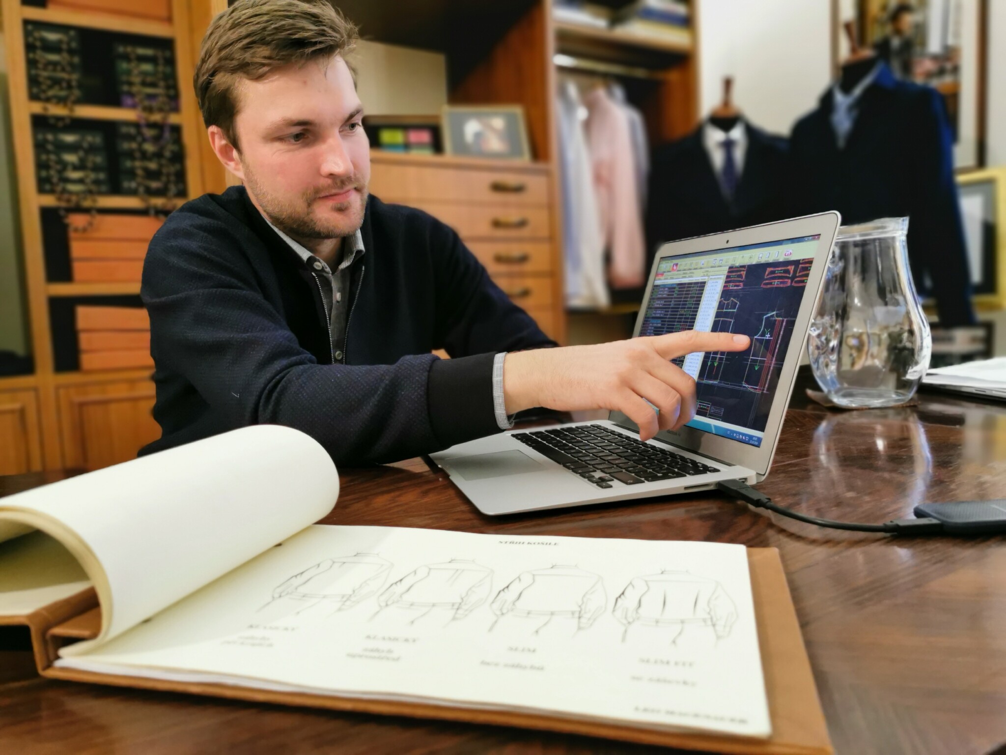 V nejfuturističtějších snech by se pak stačilo doma vyfotit zepředu a z boku, umělá inteligence by zákazníka sama změřila a ten by si za pár dnů vyzvedl na míru ušitý oblek. „Moje ideální vize je taková, že si s klientem o obleku popovídáme, jako si povídáme my dva teď spolu, pak jen zmáčknu pomyslné tlačítko a vše se začne dít just in time,“ zasní se Macenauer.