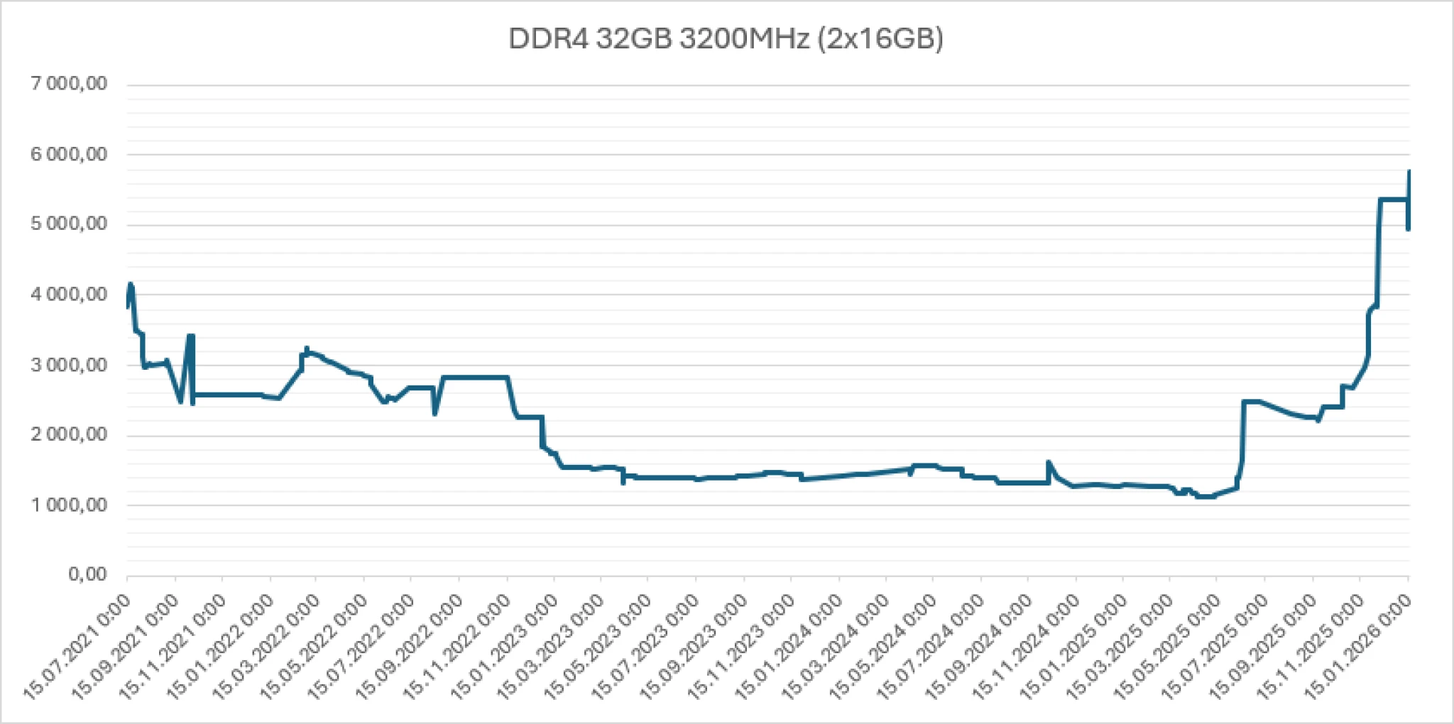 Vývoj ceny paměti DDR4 32GB 3200MHz (2 × 16 GB) v korunách. Ceny jsou uvedeny bez DPH, autorských a recyklačních poplatků. Zdroj grafu: T.S.Bohemia