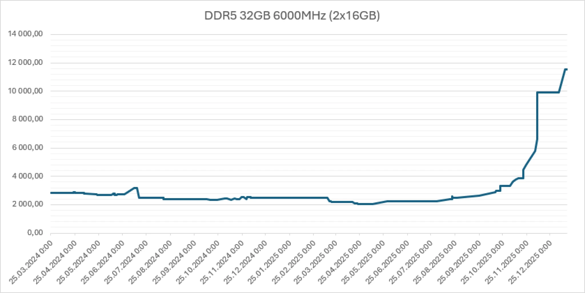 Vývoj ceny paměti DDR5 32GB 6000MHz (2 × 16 GB) v korunách. Ceny jsou uvedeny bez DPH, autorských a recyklačních poplatků. Zdroj grafu: T.S.Bohemia