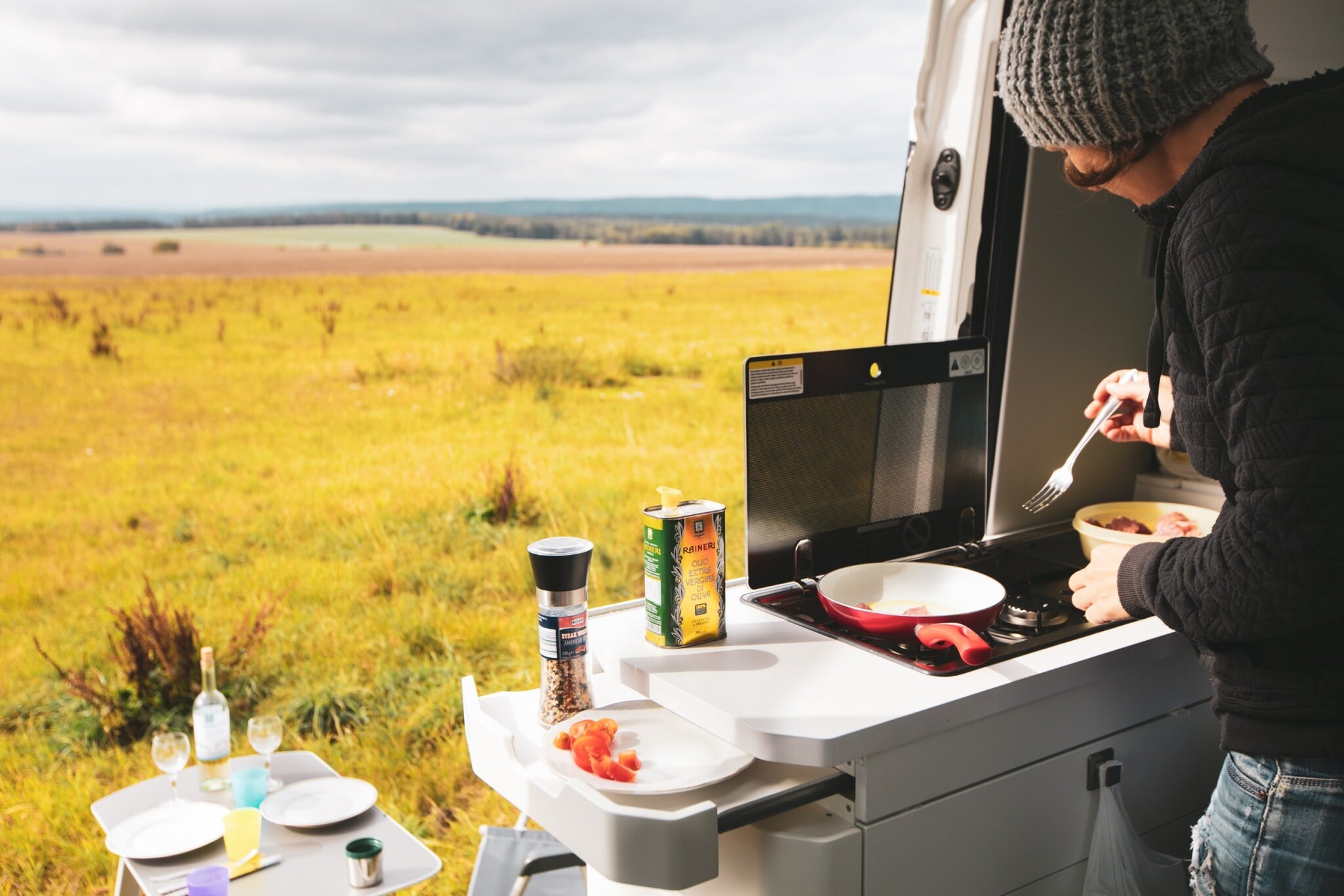 Stolitrová zásoba vody, plynové topení, plynový sporák, WC, sprcha s teplou vodou, skvělé osvětlení nebo klimatizace poháněná baterií dobíjenou během jízdy, zastínění oken, sítě proti hmyzu, odkládacích prostor tolik, že pořád něco hledáte… Vážně je tu všechno. A většina techniky se jednoduše ovládá skrze dotykový displej.