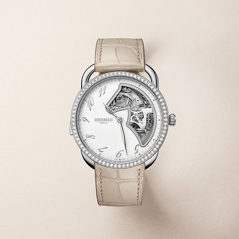 Jako obvykle ukazuje Hermès v kolekci Arceau dvě svoje silné stránky: umění tvořit poetické kousky a zároveň řemeslo špičkové hodinařiny. Mají komplikaci minutové repetice a motiv koně, který odkazuje ke kořenům značky. Nabízí se v bílém nebo růžovém zlatu.