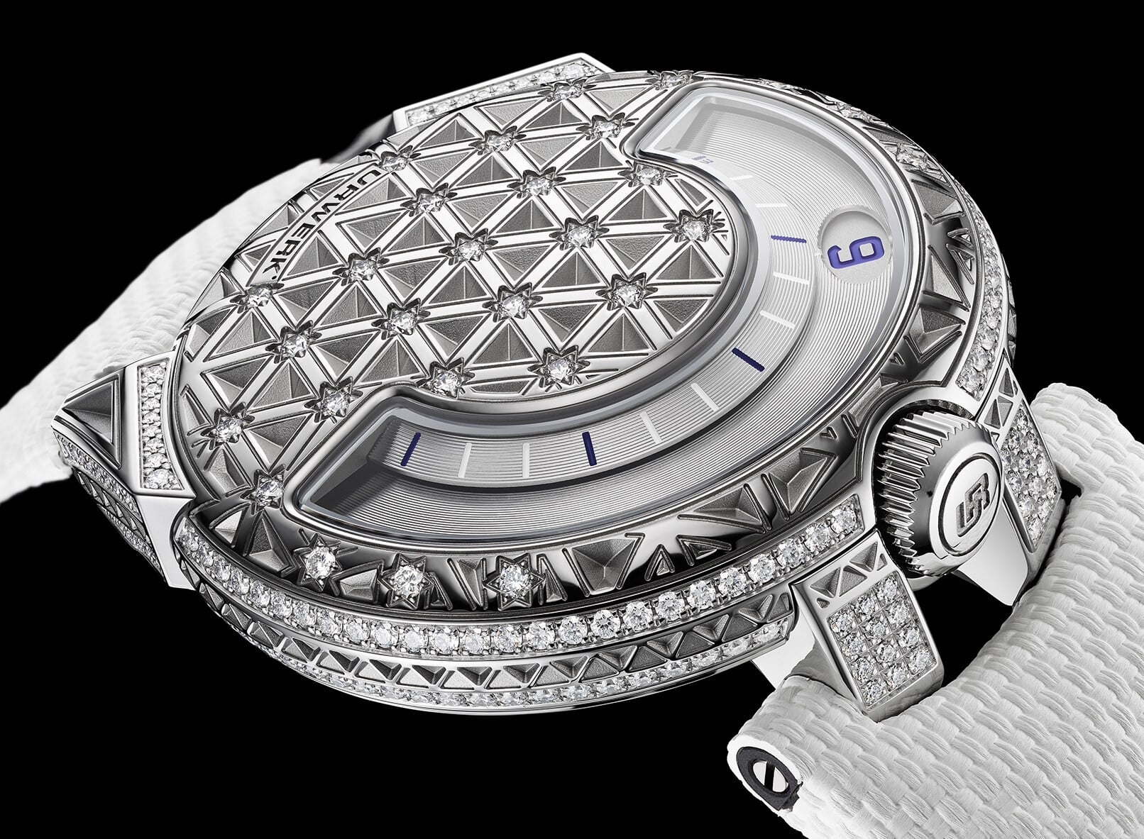 K tradičně nepřehlédnutelným brandům se řadí menší švýcarská značka Urwerk. Její novinka má symbolizovat noční oblohu, a to prostřednictvím 214 diamantů na ocelovém pouzdře. Limitovaná edice 25 kusů.