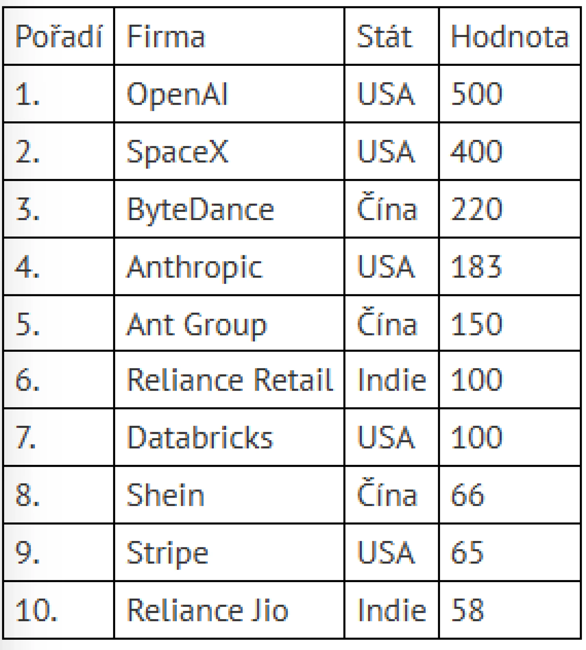 Nejhodnotnější startupy světa (hodnota v miliardách dolarů).
