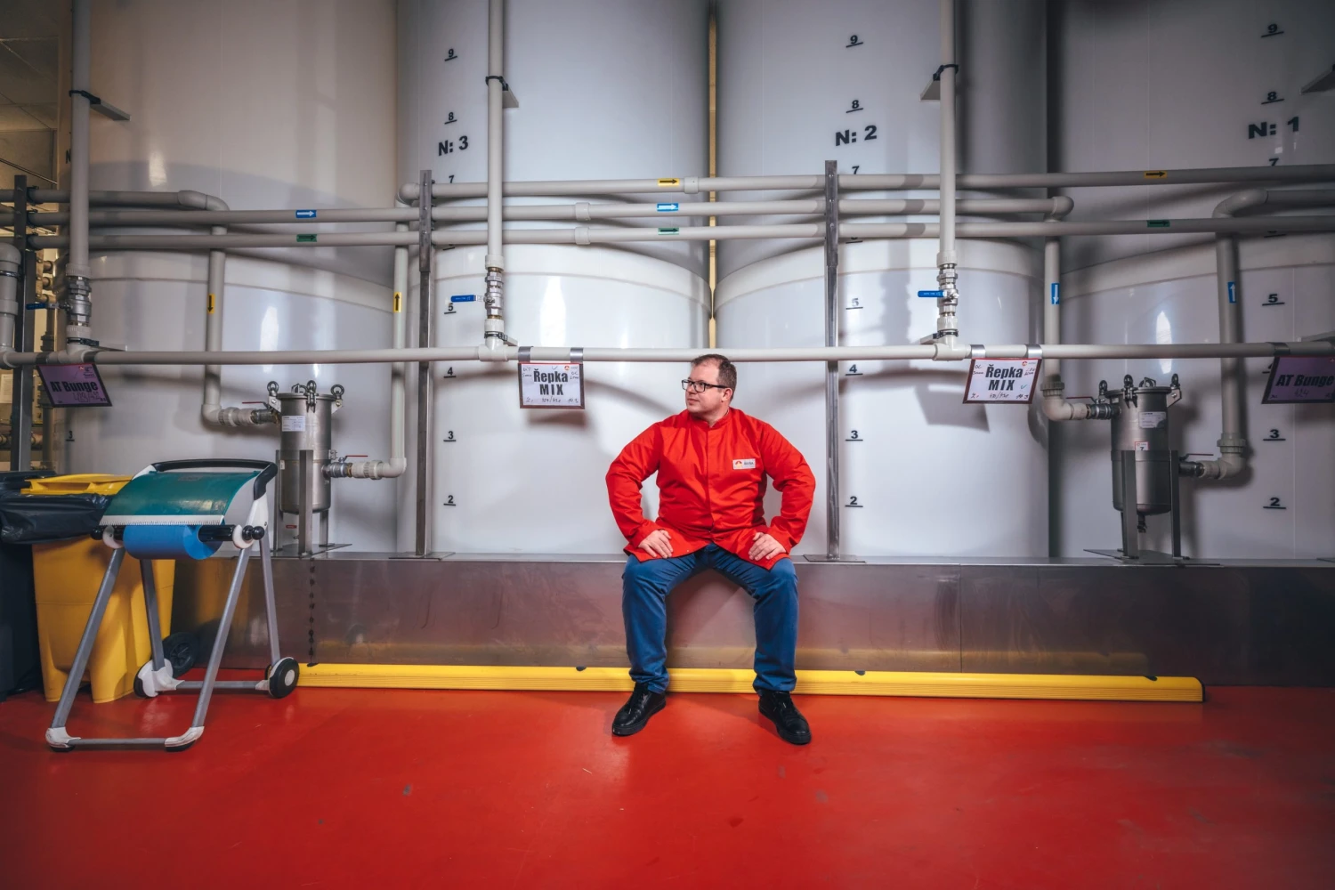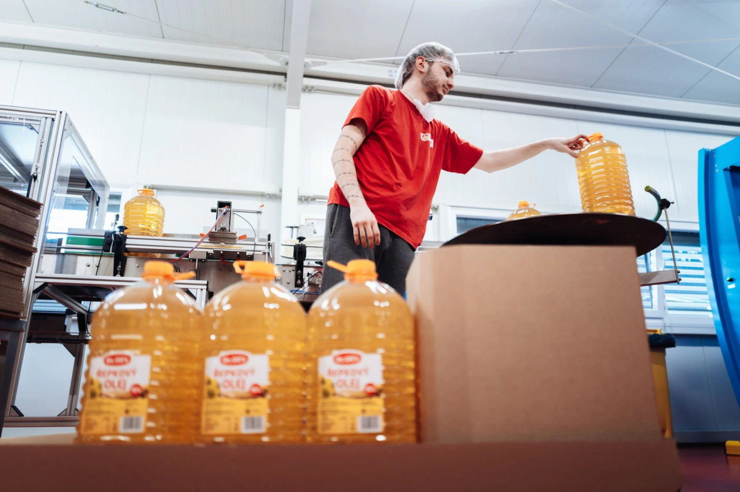 Sem, do bzenecké továrny, se vozí rafinovaný olej v cisternách a stáčí do lahví a kanystrů. Necelou polovinu produkce ale ještě předtím čeká vylepšení. Mixují se tu dohromady například různé druhy olejů – třeba slunečnicový s řepkovým, přidávají se do nich vitaminy či aroma.