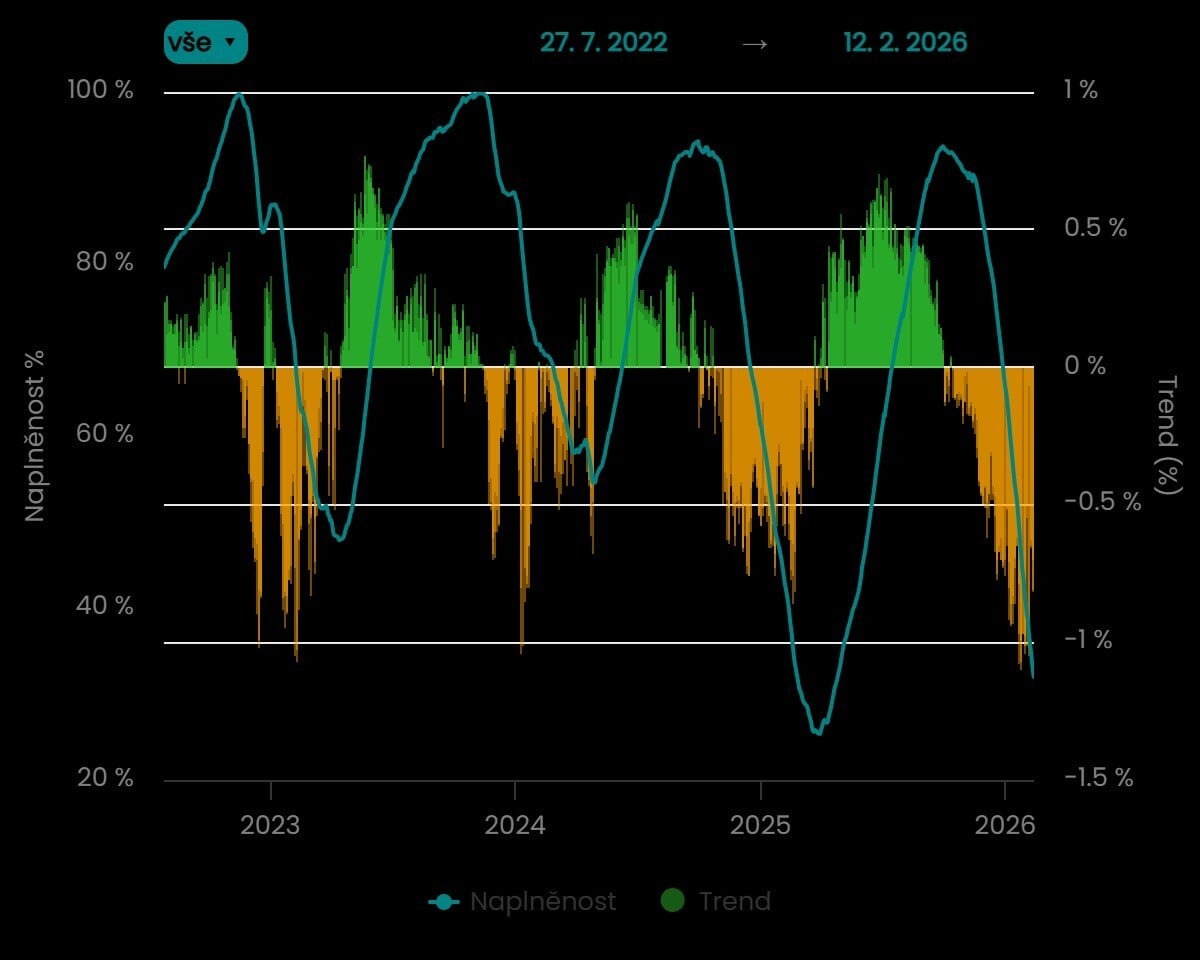 Podzemní zásobníky zemního plynu na českém území určených pro domácí spotřebu (tedy vyjma zásobníku slovenského SPP na Moravě, kde plyn uskladňuje Slovensko) jsou dnes naplněny z 32 procent. Loni to přitom bylo o dvanáct procentních bodů výše, předloni dokonce o téměř čtyřicet procent.