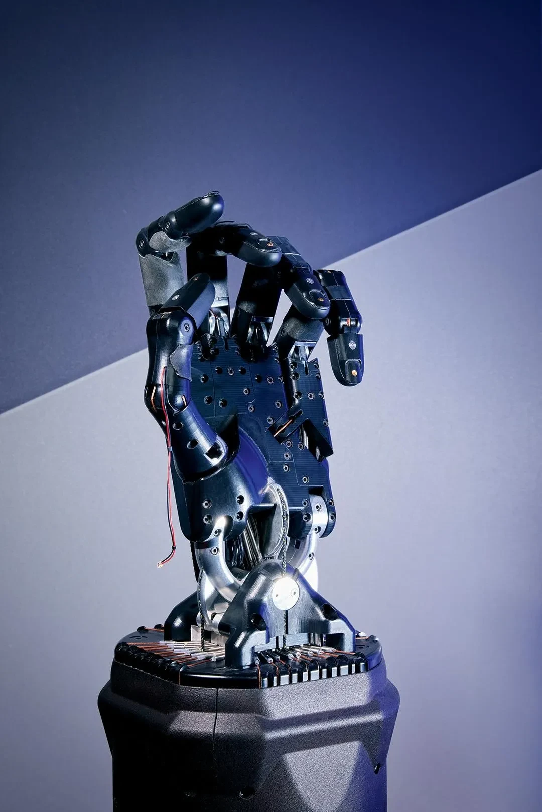 Pilotní dlaň | Mezi Altmanovými artefakty najdete i tuhle robotickou ruku. V OpenAI ji sestrojili proto, aby naučili umělou inteligenci složit Rubikovu kostku. „Byla to neuvěřitelně křehká záležitost,“ vzpomíná Altman, „ty šlachy v ní praskaly v jednom kuse.“