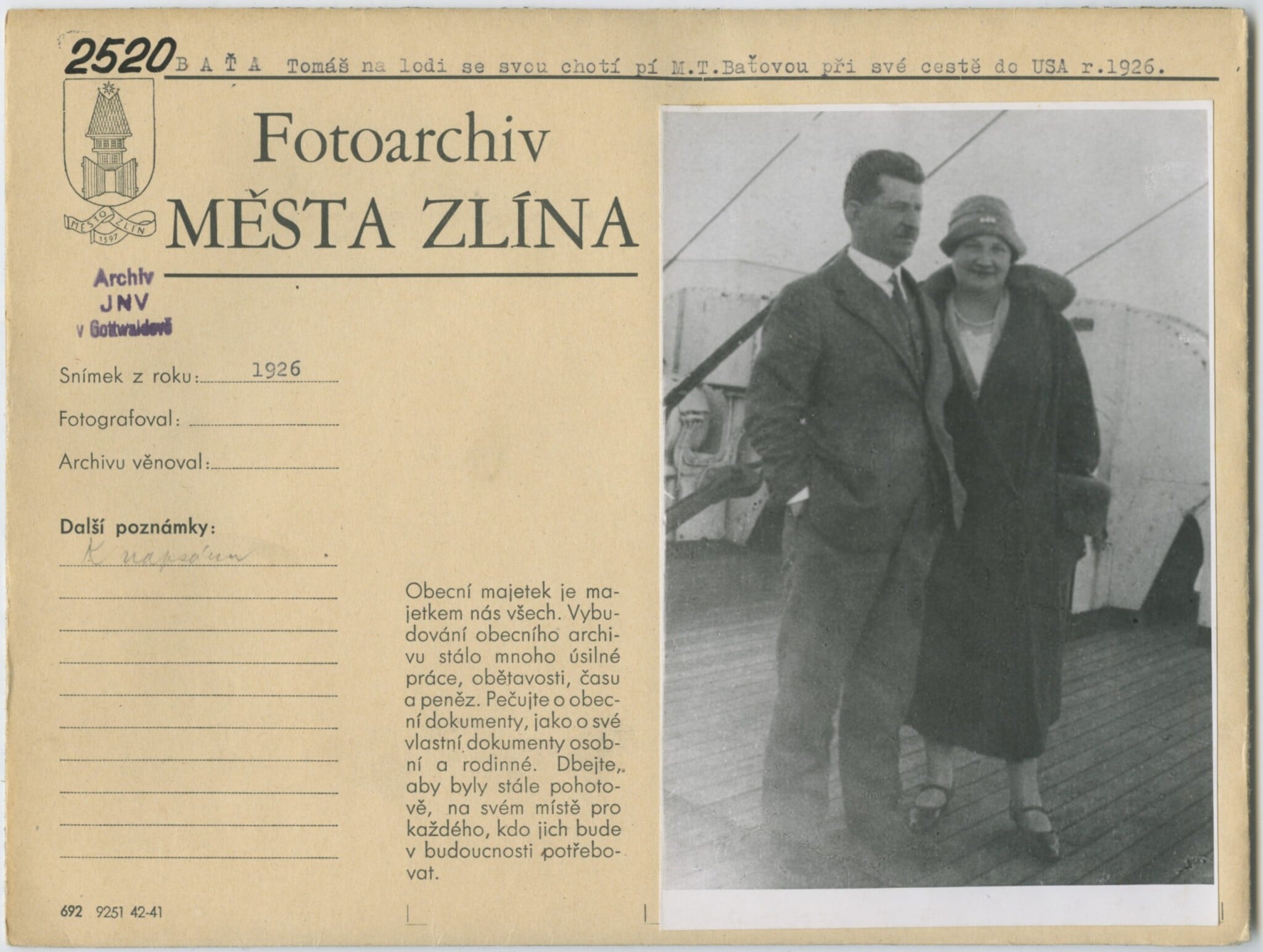 Manželé Baťovi na lodi při své cestě do USA, 1926 (SOkA Zlín, o. č. 2520, p. č. 1)