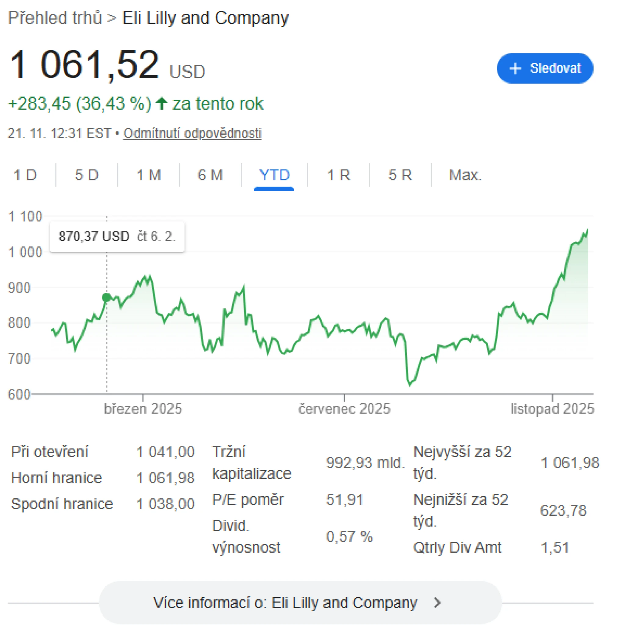 Výkon akcií firmy výrazně překonal americký akciový trh. Od uvedení přípravku na obezitu Zepbound na trh koncem roku 2023 akcie Eli Lilly stouply o více než 75 procent. Širší akciový index S&P 500 za stejnou dobu posílil o více než padesát procent.