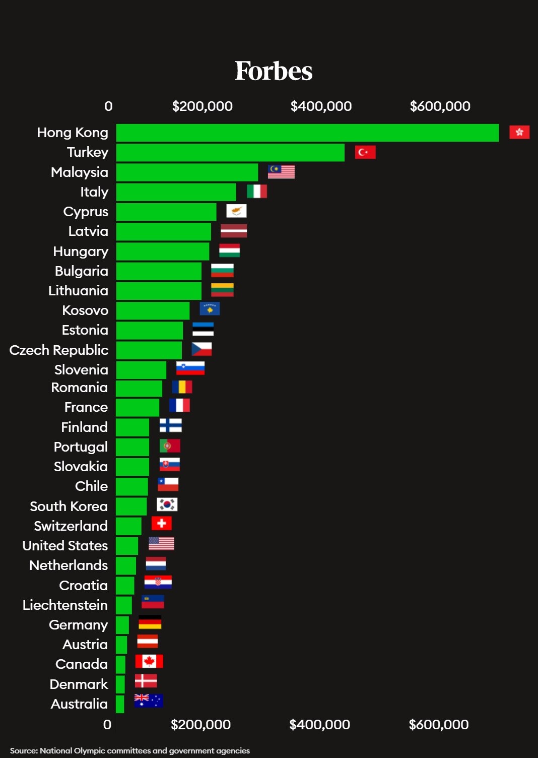 Pouze čtyři z nich jednoznačně uvedly, že neplánují vyplácet svým sportovcům nějaký bonus výslovně za zisk medailí. Naopak vyplacení peněžních prémií za medailové pozice plánuje nejméně 32 zemí. Toto jsou nejštědřejší z nich: