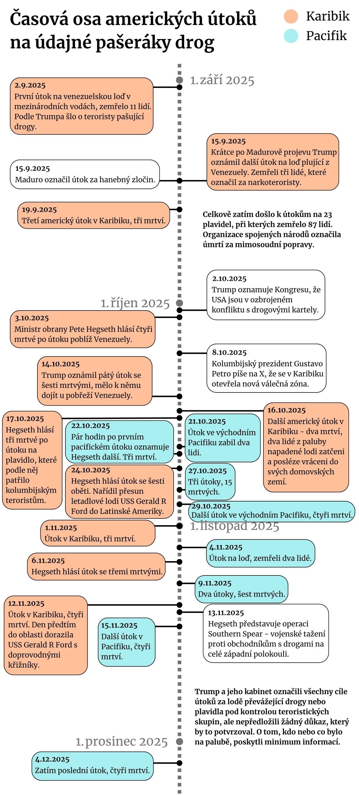 USA už od září demonstrují svou vojenskou sílu v mezinárodních vodách poblíž Venezuely, kde potápějí lodě, o nichž tvrdí, že pašují drogy. Tyto útoky, jež se koncem října rozšířily i na operace ve východním Pacifiku, už podle dostupných informací zasáhly 23 plavidel a zemřelo při nich 87 lidí.