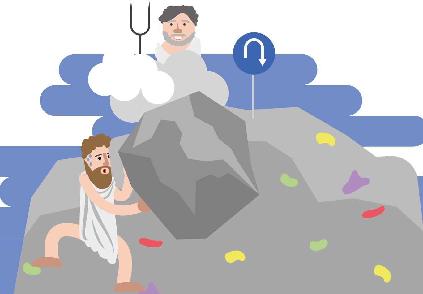 Sisyfos je nejchytřejší z lidí. Nebo nejprohnanější? Každopádně přelstít řecké bohy ne jednou, ale rovnou dvakrát se nevyplácí. Přijde krutý trest. Bouldering. Lezecká stěna a k ní skutečný balvan. Zvednout, vyšplhat těsně k vrcholu a spadnout zpátky na start. Pořád dokola, na věky věků.