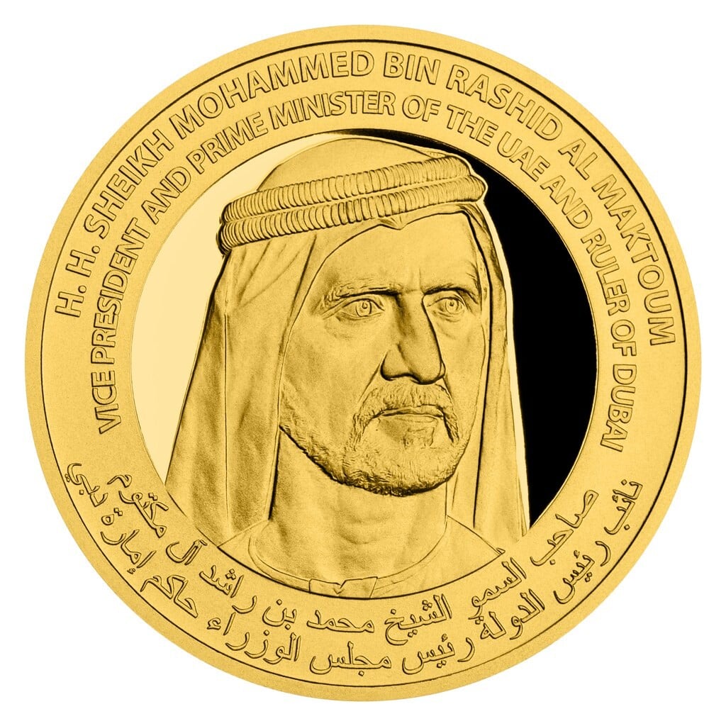 Mince s portrétem dubajského šejka Muhammada bin Rašída Al Maktúma, foto Česká mincovna