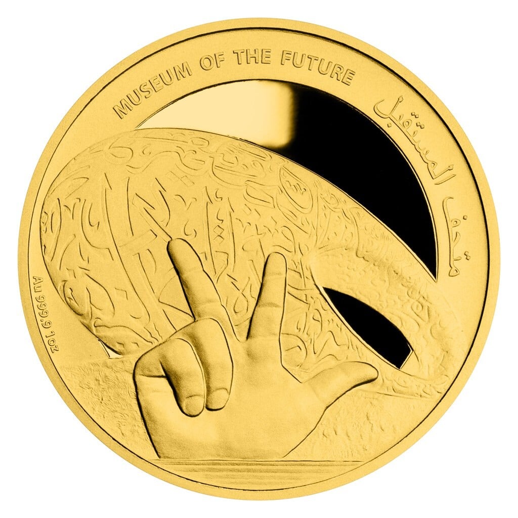 Mince z dílny České mincovny s obrázkem dubajského Muzea budoucnosti, foto Česká mincovna