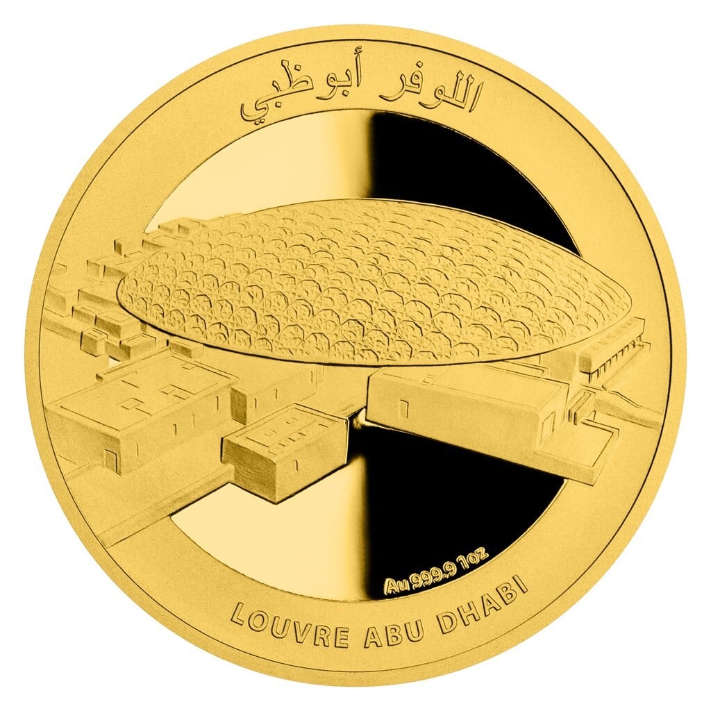 Mince z dílny České mincovny s vyobrazením Louvru v Abú Dhabí, foto Česká mincovna