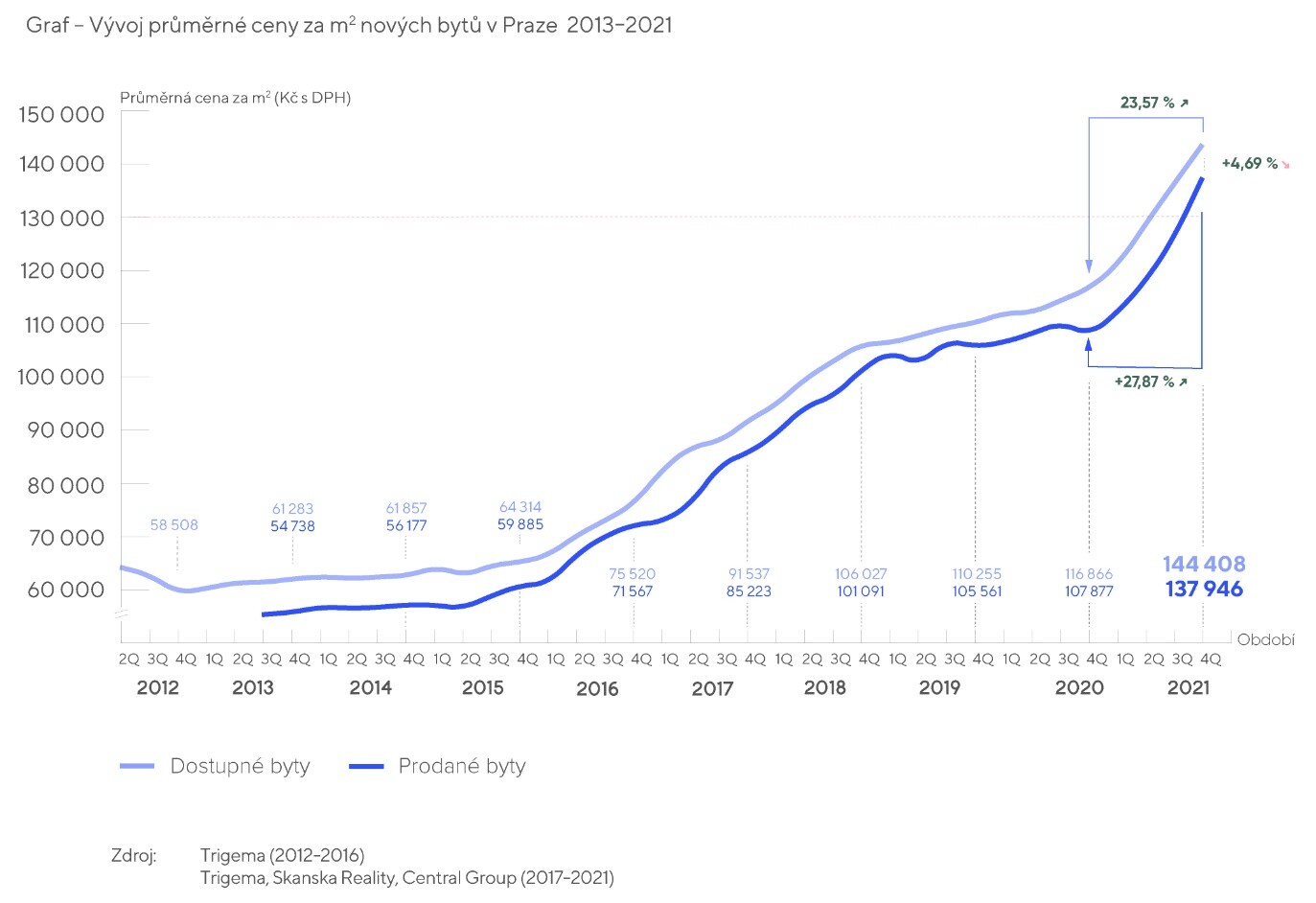 Rozevírající se nůžky mezi poptávkou a nabídkou v loňském roce přinesly prudký nárůst cen nových bytů. Prodejní cena ve čtvrtém čtvrtletí loňského roku byla v průměru 138 tisíc korun za metr čtvereční, což znamená meziroční nárůst o 28 procent. Při průměrné výměře nového bytu kolem 67 metrů čtverečních tak v Praze stál na konci loňského roku nový byt v průměru 9,2 milionu.