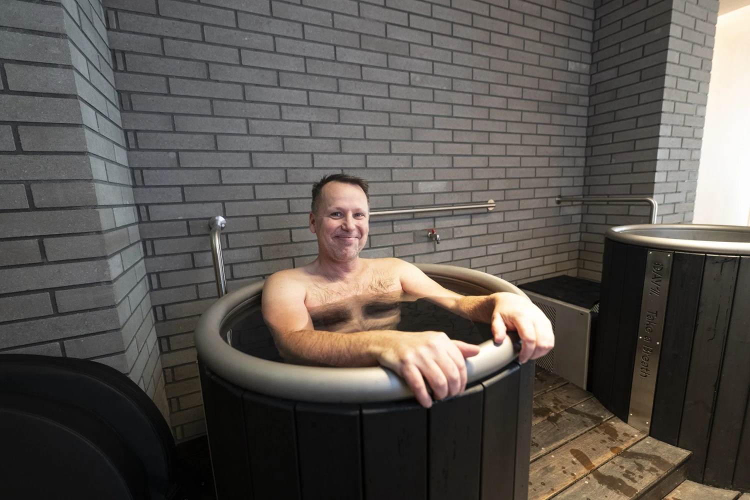 Poslední patro je určeno pro longevity. Je v něm designově vyvedený wellness, zmiňovaná kryokomora, na nás už čekají kádě s vodou o teplotě čtyř stupňů a u nich instruktor.