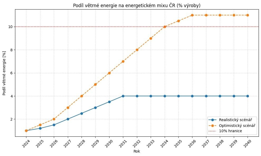 Takové plány na rozvoj větrné energetiky jsou nicméně ambiciózní, a pokud bychom pokračovali dosavadním tempem, do konce tohoto desetiletí vítr v energetickém mixu Česka nepřekročí ani tři procenta.