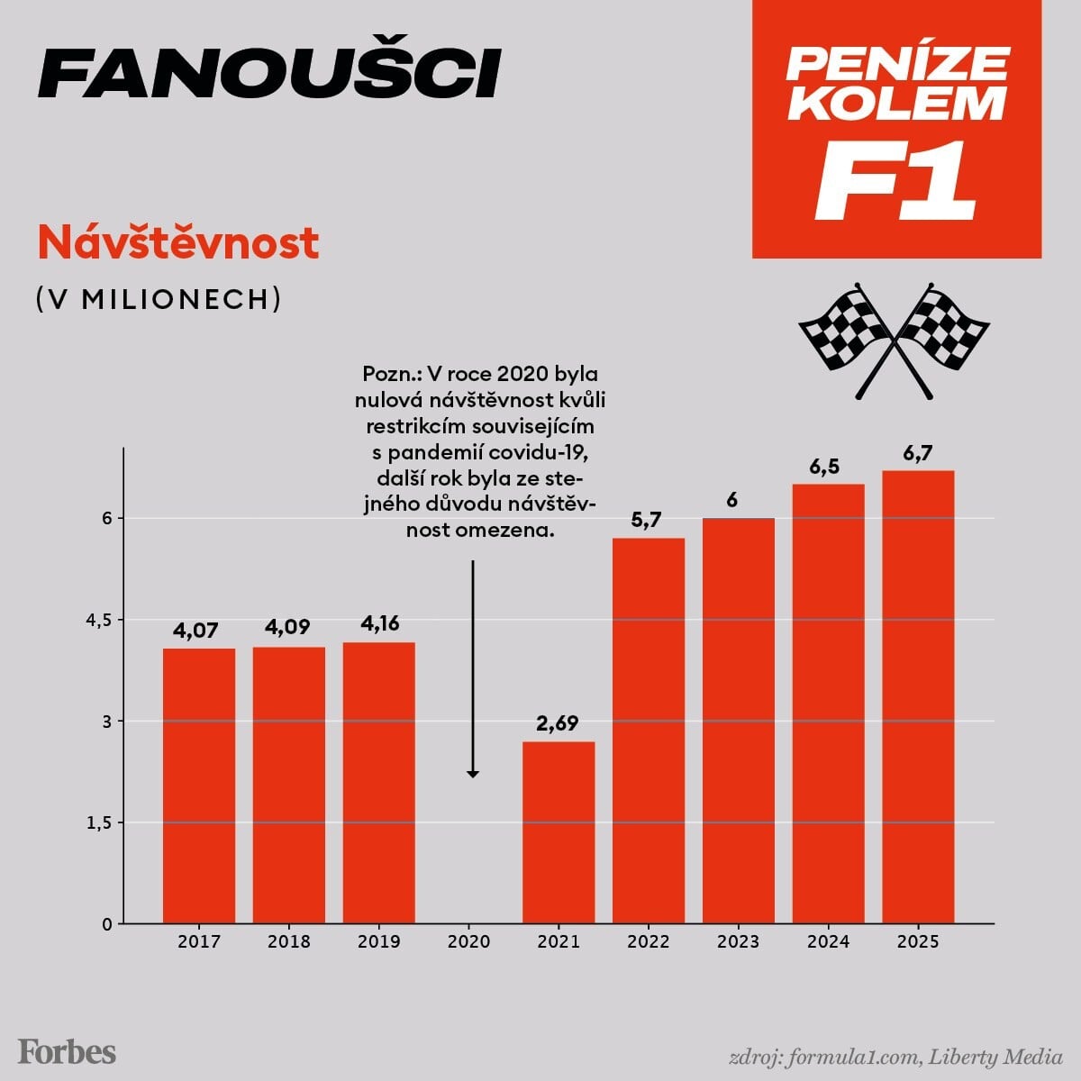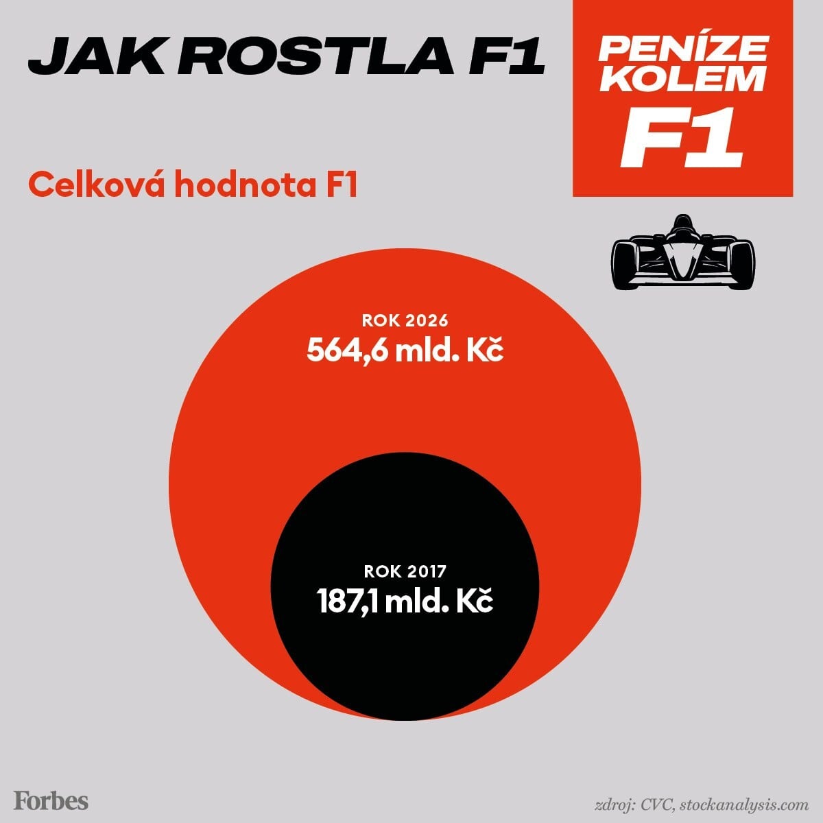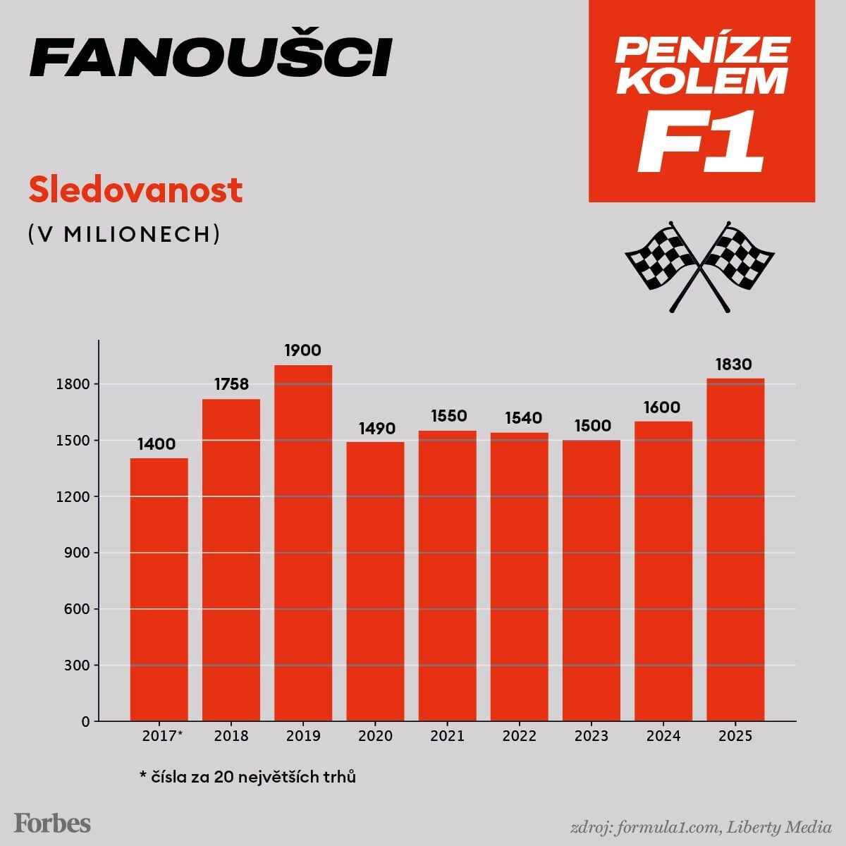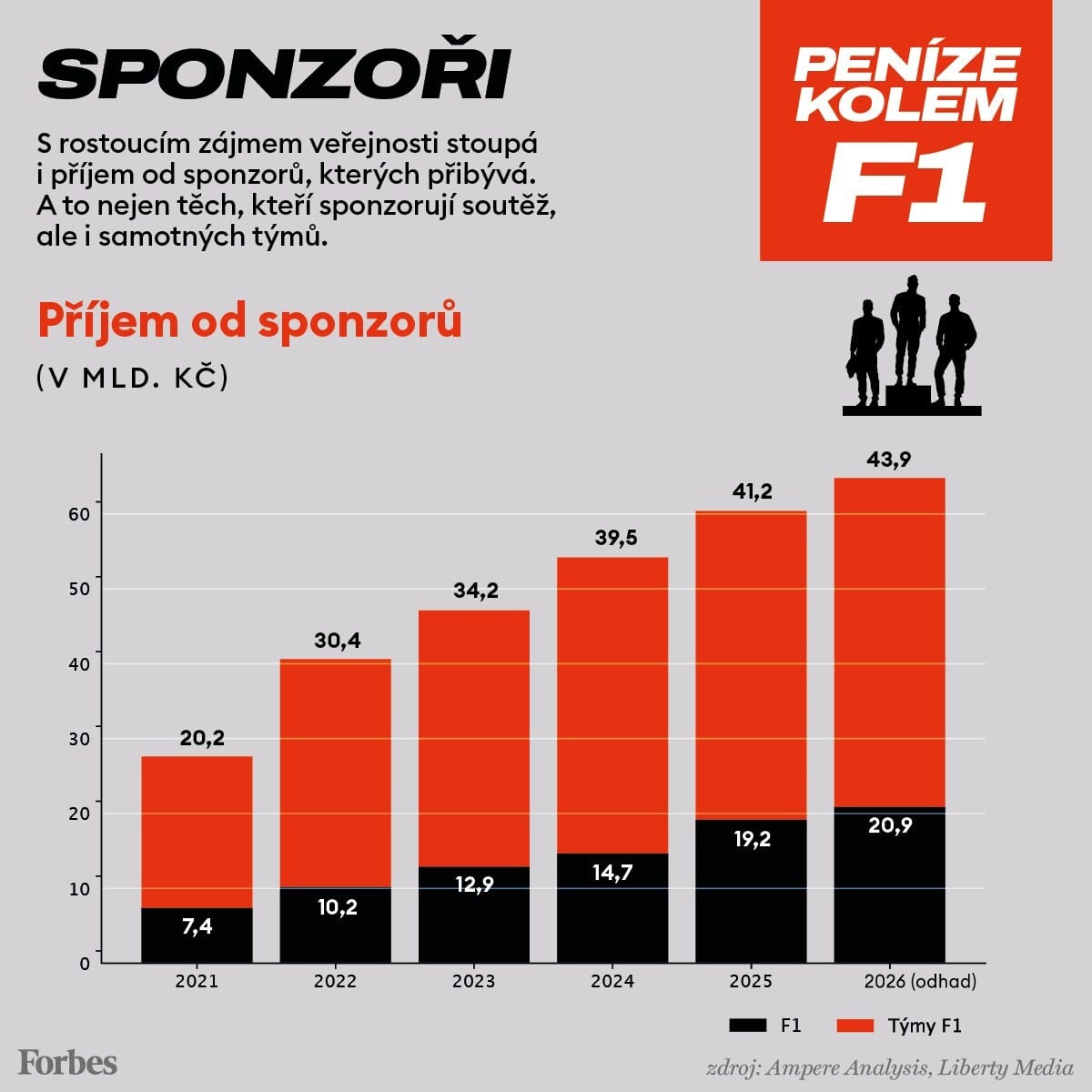 Vše svědčí o tom, jak se s růstem popularity zvedá také množství peněz kolem F1. Jen příjmy od sponzorů každoročně stanovují novou rekordní hranici. To má vliv i na hodnotu značky formule 1. Ta se od roku 2017, kdy ji přebrala společnost Liberty Media, zvedla trojnásobně: z osmi miliard dolarů na asi 27 miliard, v přepočtu půl bilionu korun.
