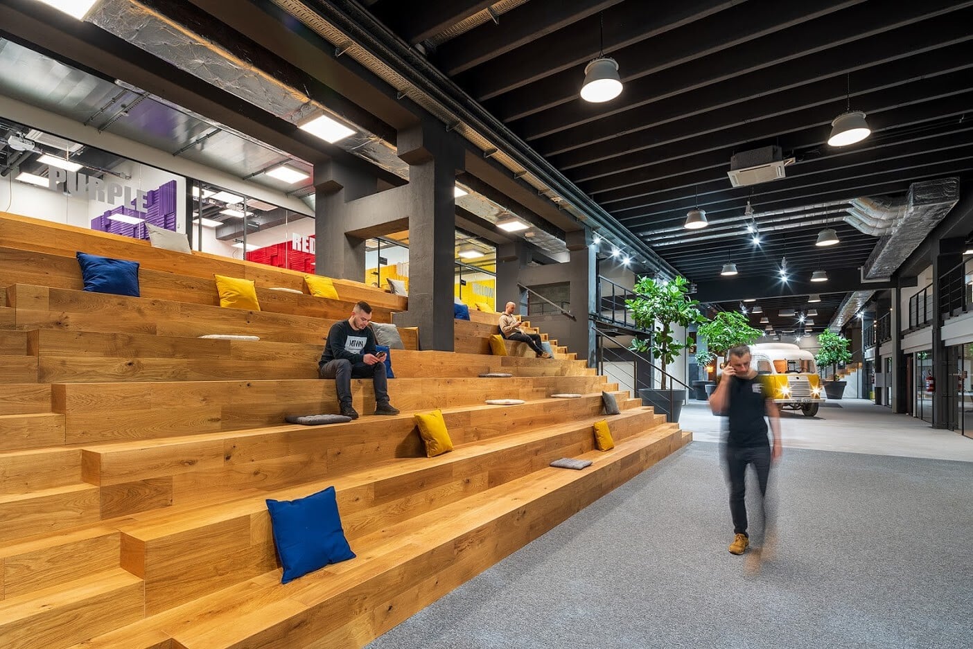 Zaručeně nejoriginálnější místo pro schůzku nabízí předělaný starý náklaďák Saviem. Do budovy ho firma dostala jeřábem přes střechu v době, kdy budovala požární schodiště. Hned vedle něj se nachází také velká kavárna, která je srdcem kanceláří – kvůli pandemii zatím zavřeným.